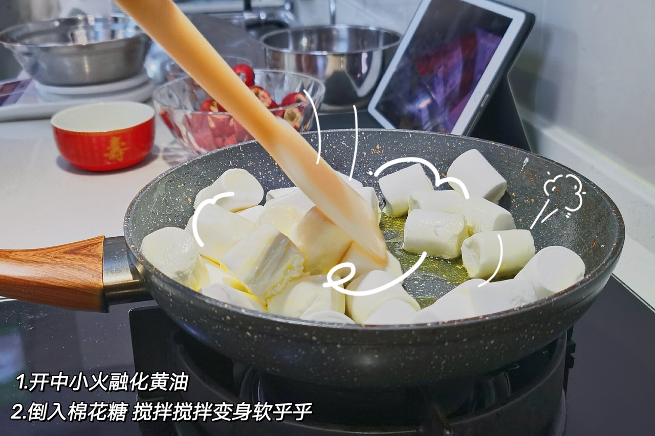 步骤1、小火融化黄油,倒入棉花糖小火翻板均匀