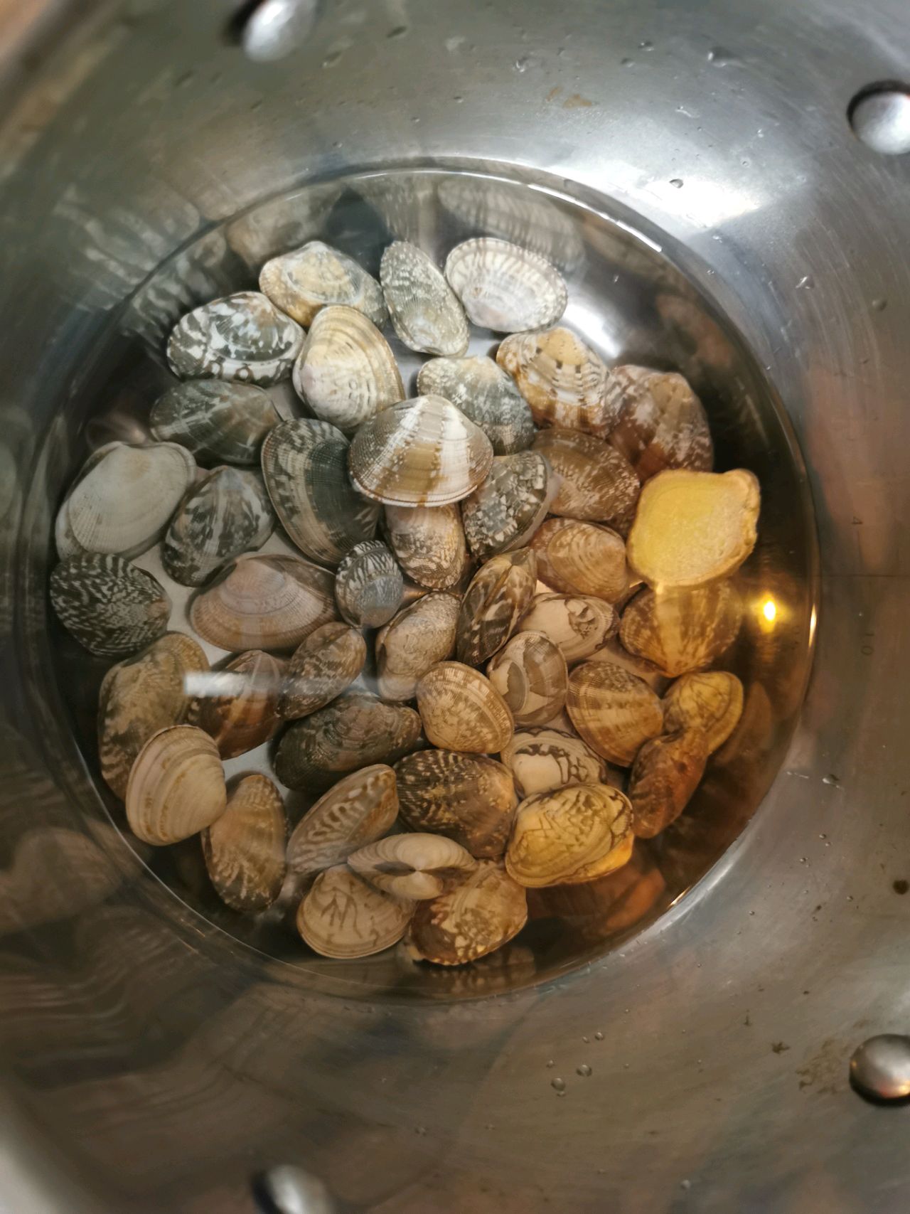 步骤1、蛤蜊加水,加点香油,让它吐脏。放入锅中,加水超过蛤蜊,加料酒和姜片,煮到蛤蜊开口捞出。煮蛤蜊的水静放沉淀。