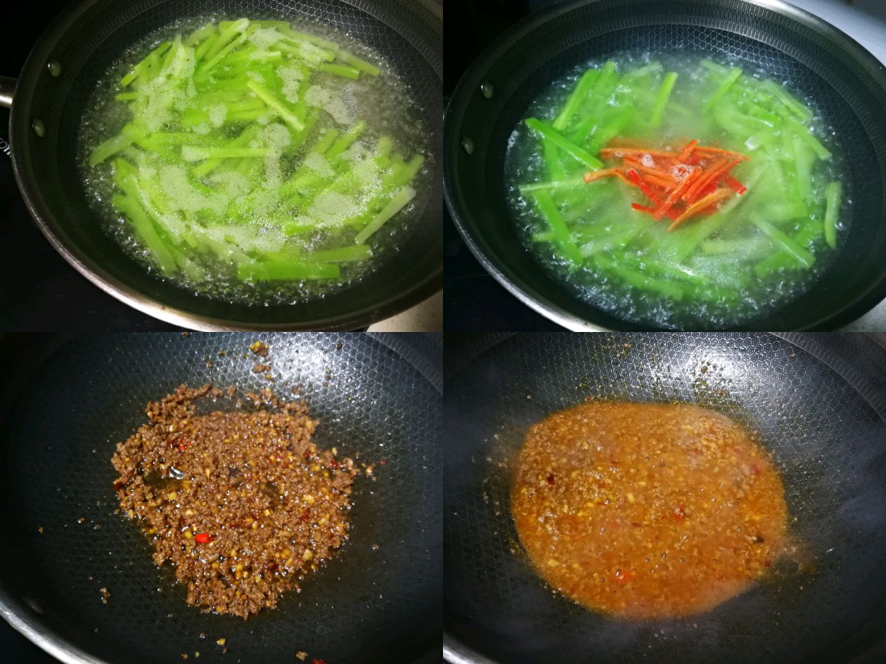 步骤2、锅烧开水放少许盐和油,倒入莴笋和红椒焯水至断生捞出沥干水分,码入盘中。热锅凉油放入牛肉末+姜蒜末+黄豆酱1勺+郫县豆瓣少许煸炒,调味:生抽1勺+鸡精少许+小米椒炒匀,出锅前淋入香油少许,勾入薄芡,盛出浇到莴笋上面,完成。