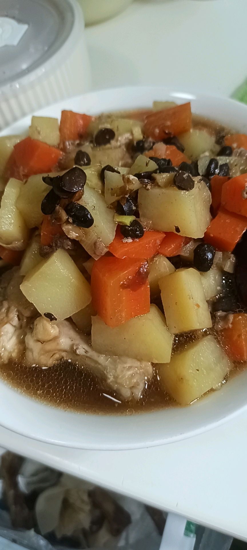 辅料:葱1段、鸡翅根若干、料酒3勺、豆豉少量、红烧酱油2勺、土豆胡萝卜各1