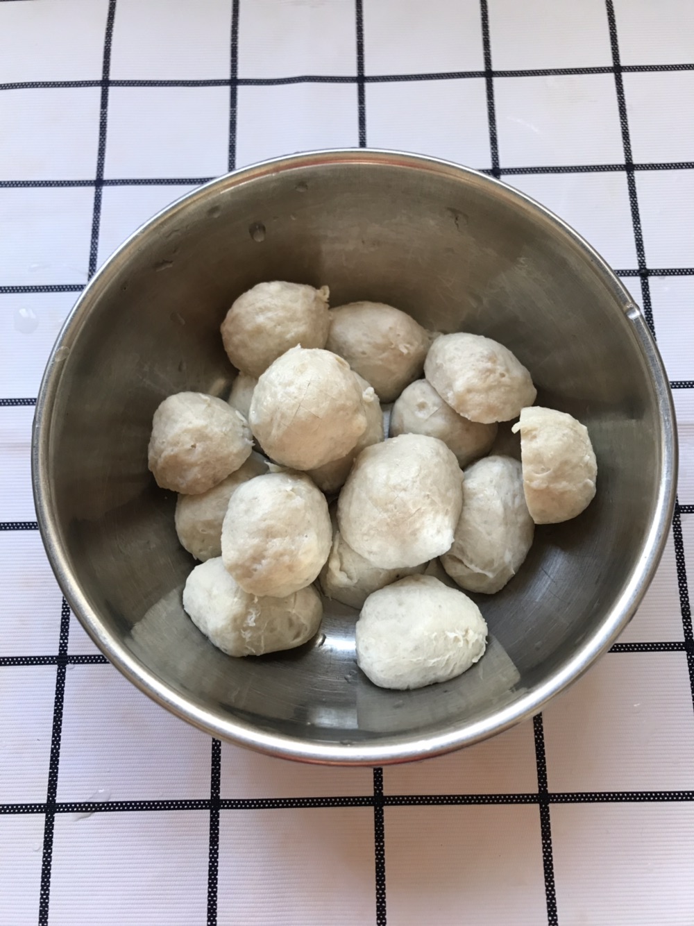 步骤1、猪肉丸洗净对半切开,改一下刀备用。
