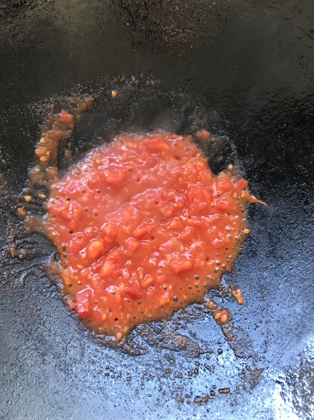 步骤3、2个西红柿削皮切粒备用,1个西红柿切块备用。