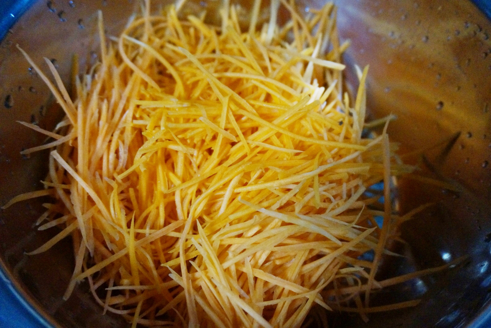 步骤2、胡萝卜擦成丝,再切成小丁。锅中放油,煸炒一下,待其变软盛出备用。西葫芦也洗净擦成细丝备用。