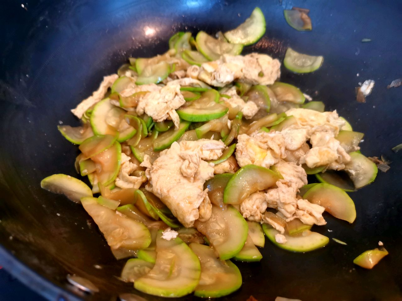 步骤10、翻炒至西葫芦明显软榻后放入鸡蛋翻炒几下,放入少许鸡精、适量麻油翻炒几下关火