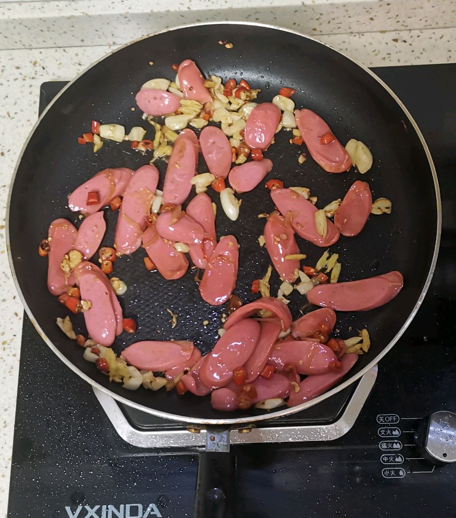 步骤6、爆香之后再将热狗放入锅中,翻炒微微有点卷。