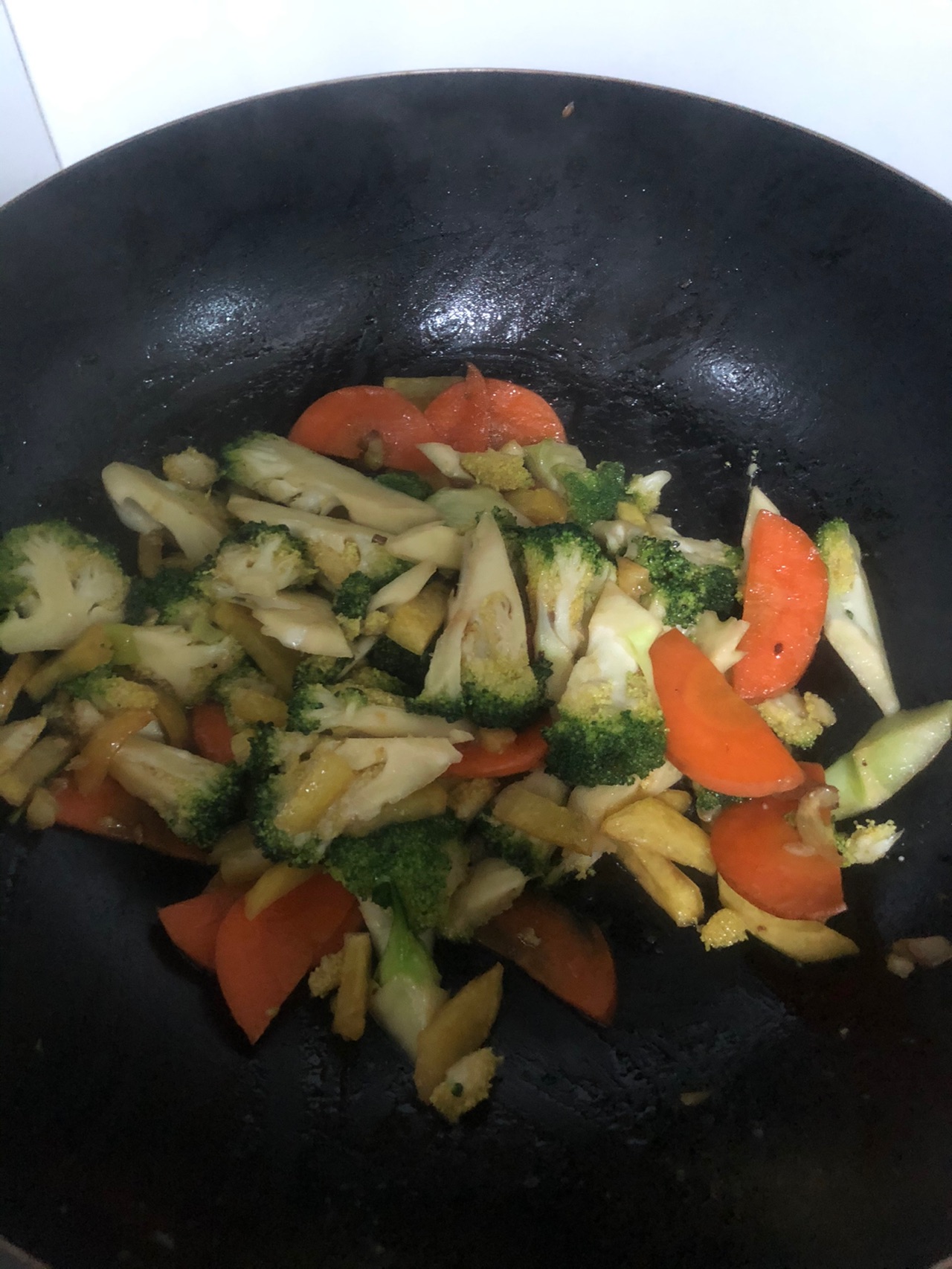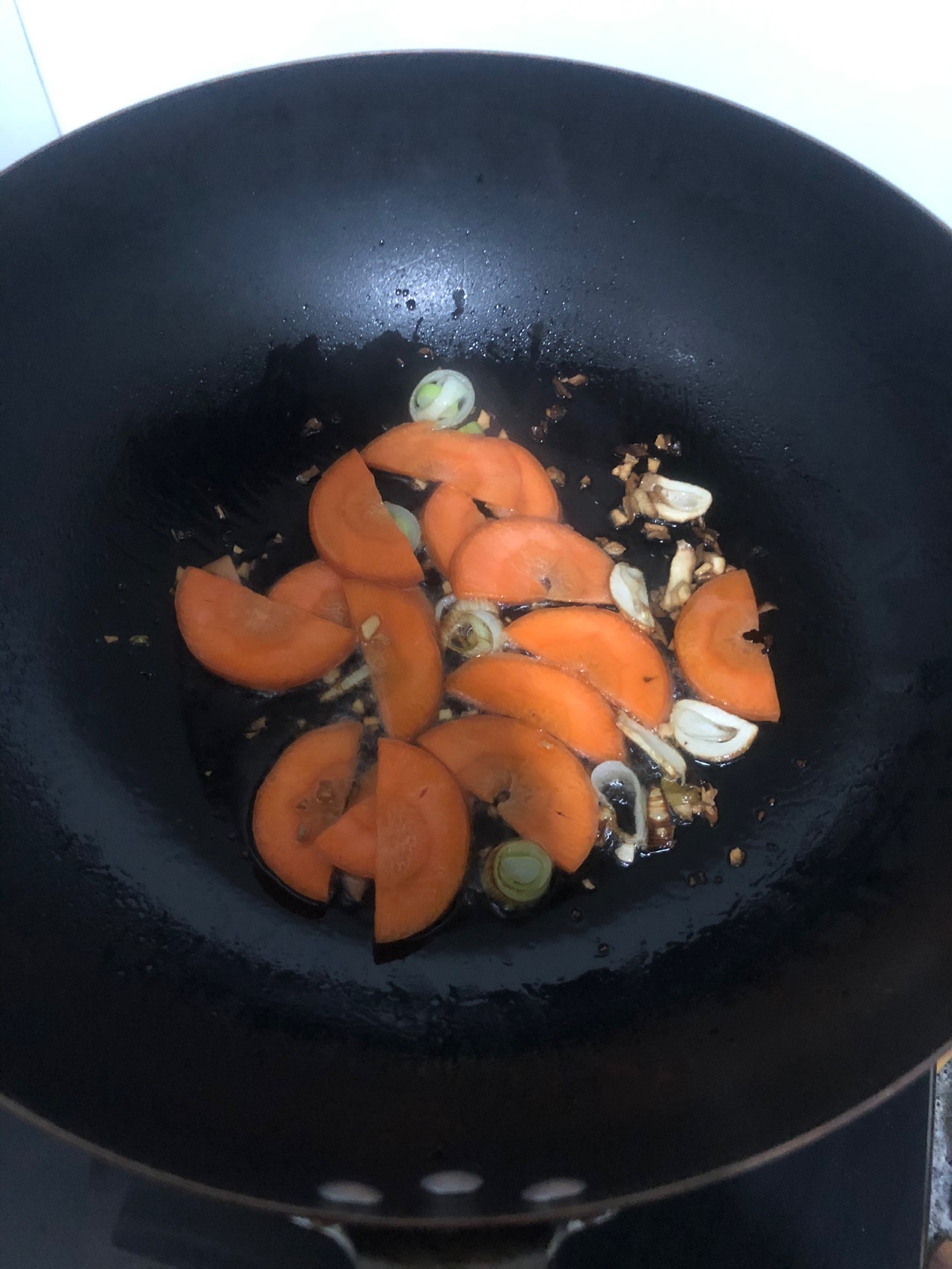 辅料:胡萝卜半根、蒜少许、葱少许、盐1小勺、蚝油1勺、鸡精1小勺
