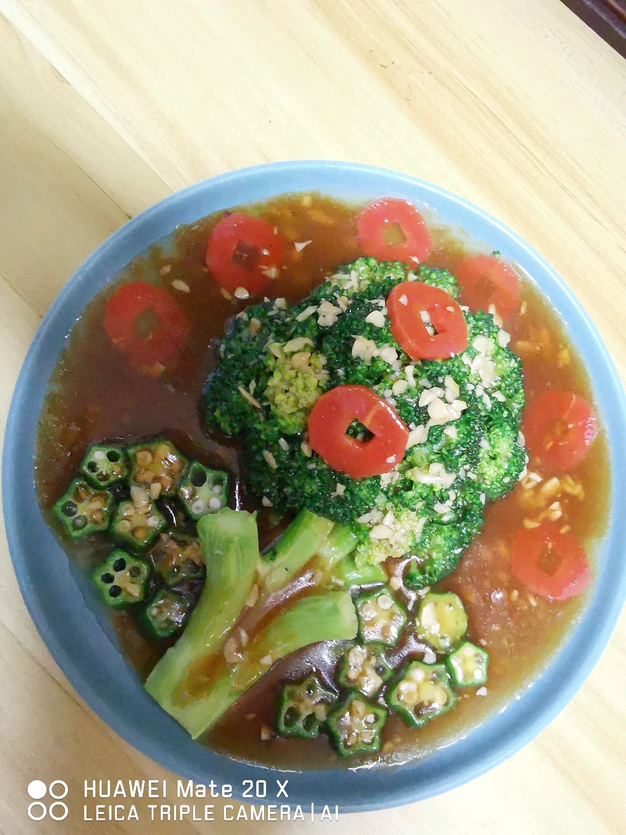 步骤5、先找个碗,加入一份生抽,2份蚝油,一点淀粉和半碗水搅匀备用。油热下蒜蓉,炒香后倒入碗里调好的汁,开锅关火。将做好的调料汁均匀的浇在摆好盘的西兰花上。我家不吃辣,小米椒就是为了好看的装饰。如果爱吃辣可以在炒蒜蓉时直接加上切好的小米椒一起炒香再倒调好的汁。