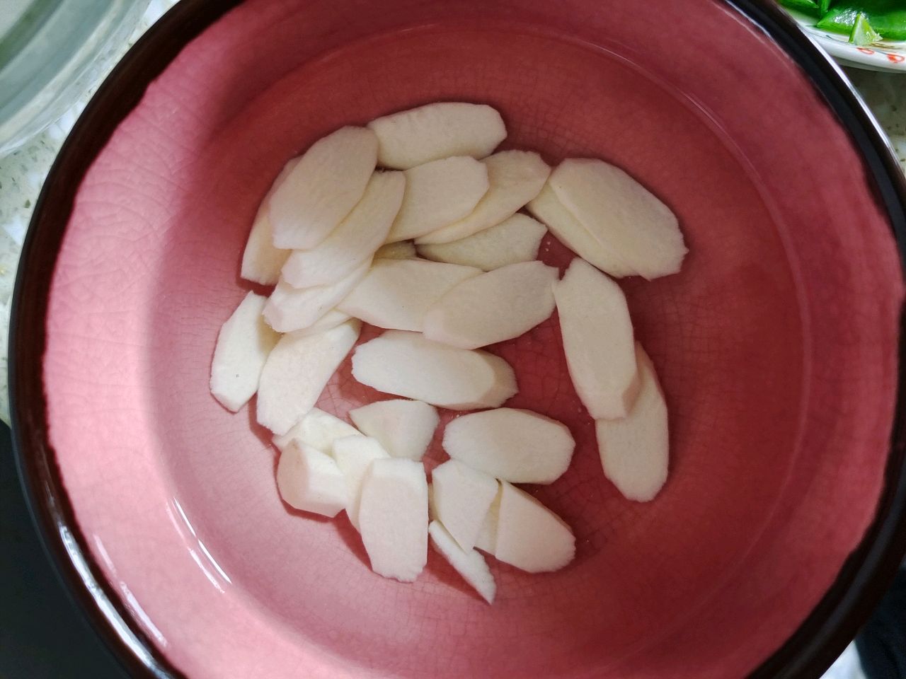 步骤3、山药切成薄片,浸在水里,防止氧化发黑。