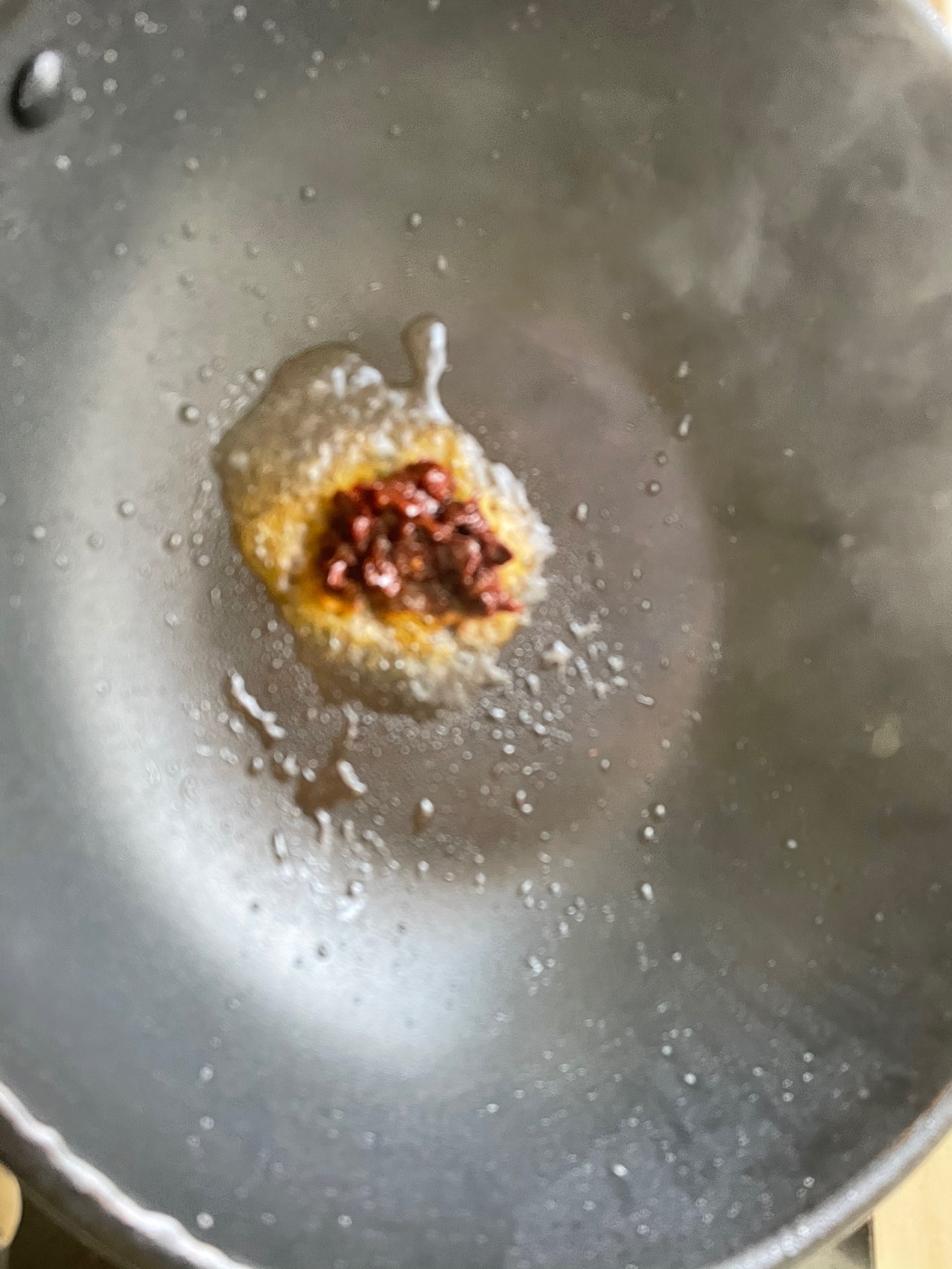 步骤9、爆香郫县豆瓣,炒出红油,后下入干辣椒、花椒、青辣椒、蒜,炒出香味。