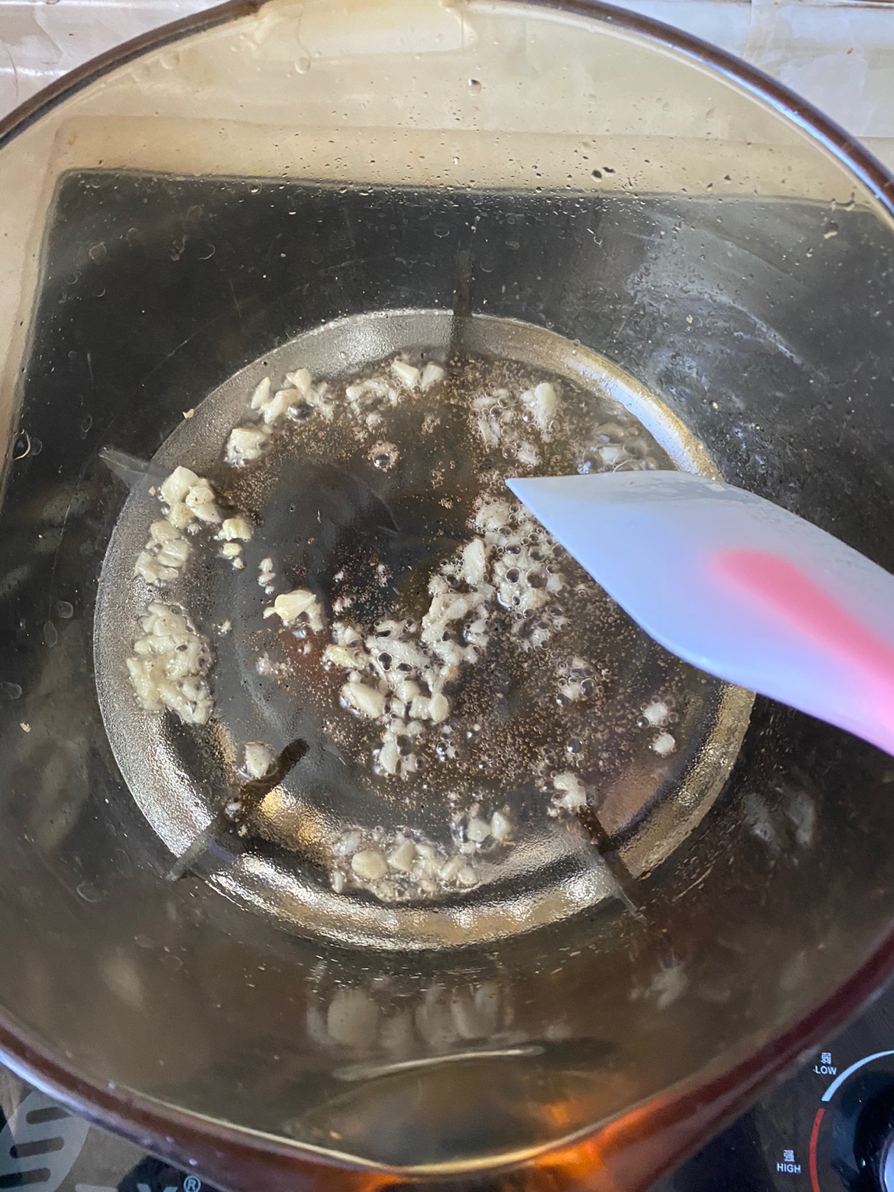 步骤1、大虾洗净去虾头、虾线;裙带菜提前泡发切小段;锅中油热后放入蒜末、五香粉炒香;