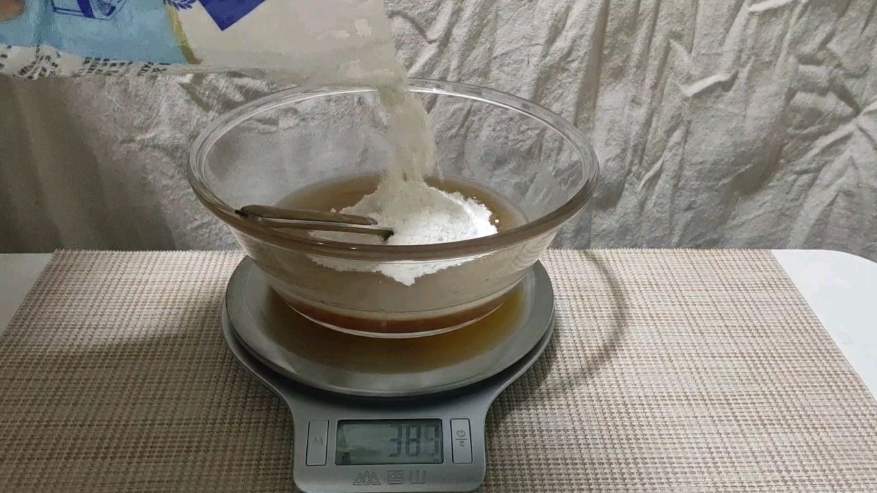 步骤1、软化糖浆150g,枧水4g,油50g依次加入。