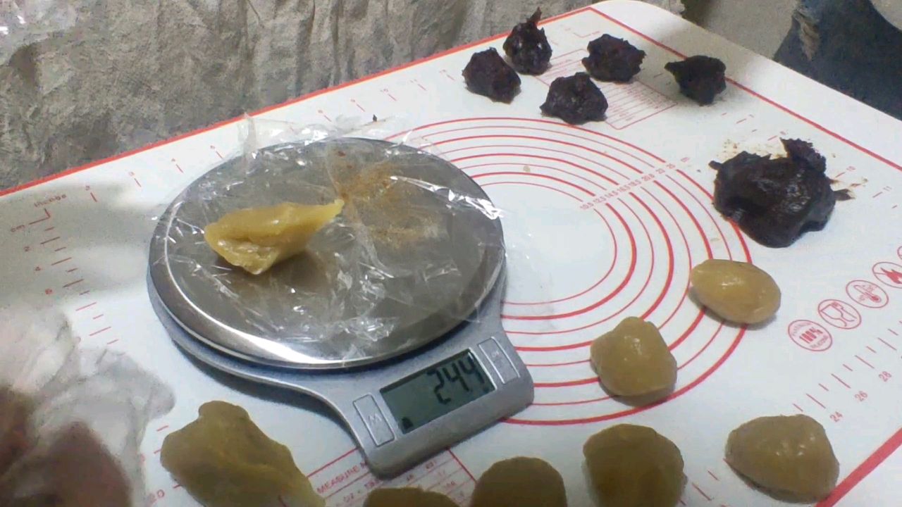 步骤7、将皮拿出来,每一块按照27g分配,然后粘上一点沾米粉,放在一边备用。网上买好的莲蓉馅和豆沙馅,都按照27g准备好。(注意豆沙比较软,最好放进冰箱冷冻半个小时,让他变硬一些,才不会太稀太粘手)