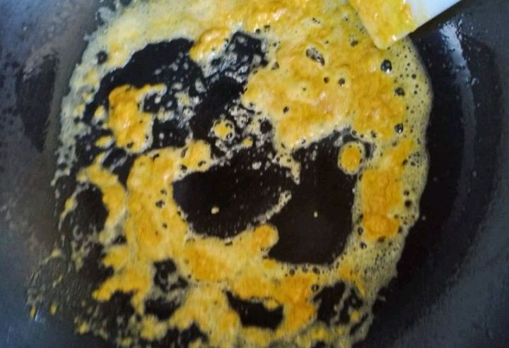步骤7、咸蛋黄压碎,倒入几滴白酒,小火不断炒出起沫即可