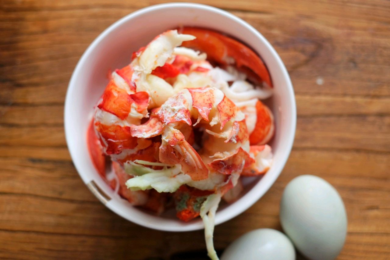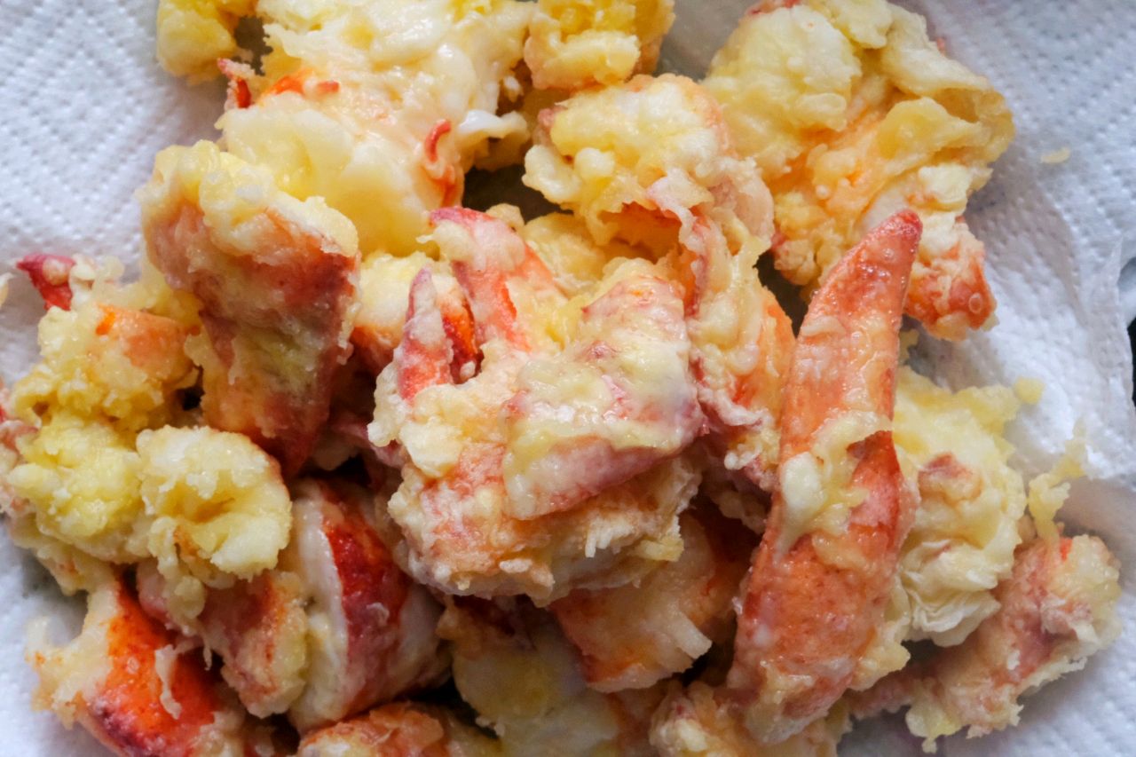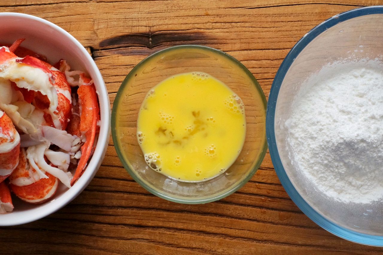 步骤4、4、将龙虾肉裹上鸡蛋液和淀粉,油6成热时下锅油炸,炸至金黄捞出。