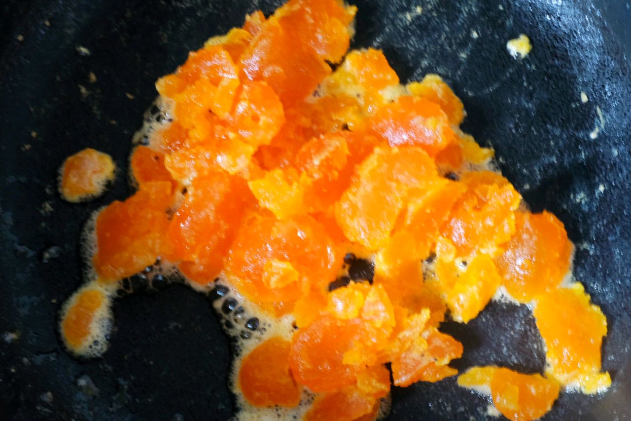 步骤5、5、锅中留底油,将咸鸭蛋黄放入锅中炒热撵碎。