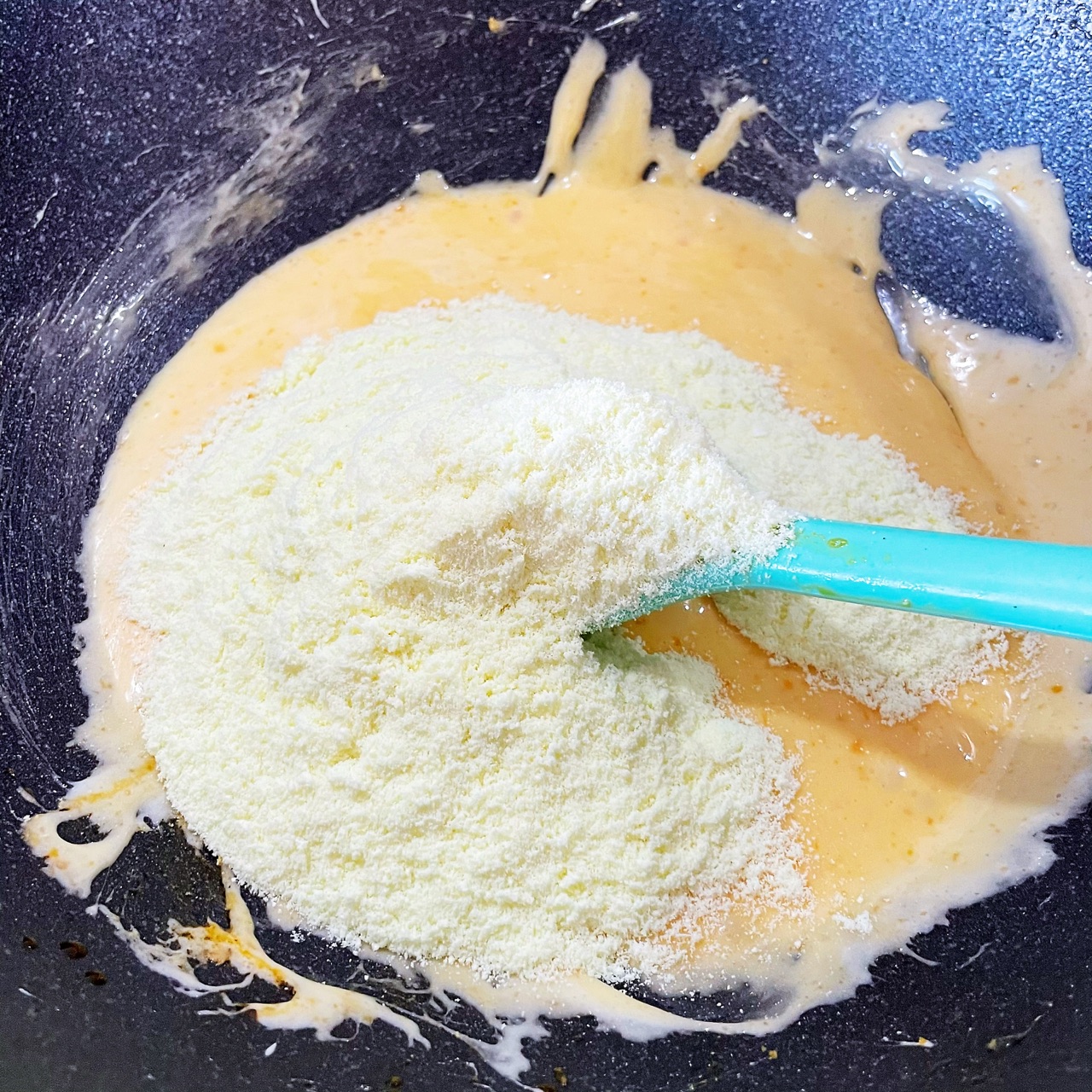 辅料:奶粉80克、咸蛋黄2个、海苔肉松30克、小奇福饼干150克