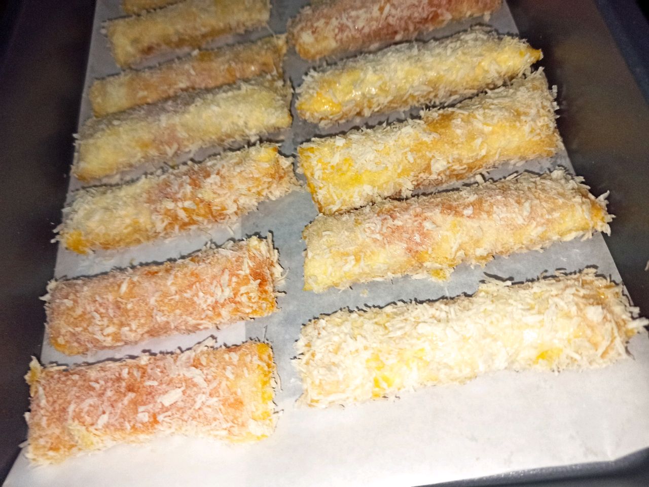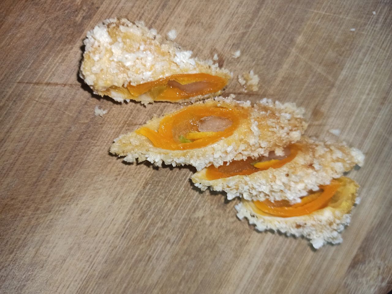 辅料:沾糖肥猪油5条、鸡蛋1只、面包糠适量、橙皮5条、香菜梗5根、咸蛋黄5个、冬瓜5小块