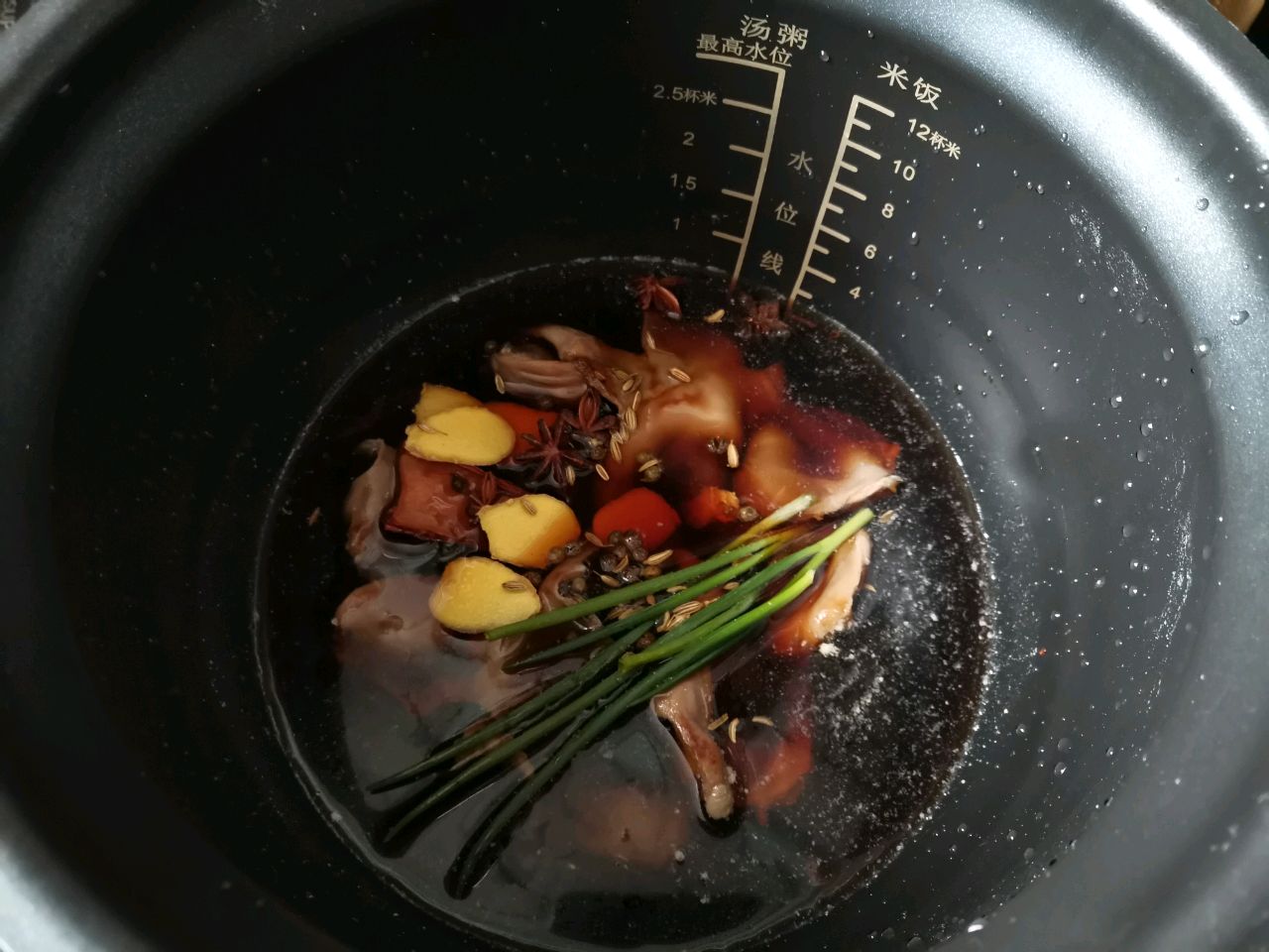 步骤4、使用高压锅来煮的时间比较短,方便一点。锅里放入没过鸭珍的清水。放入葱姜八角料酒,生抽。鲜的鸭胗要放入少许的盐。