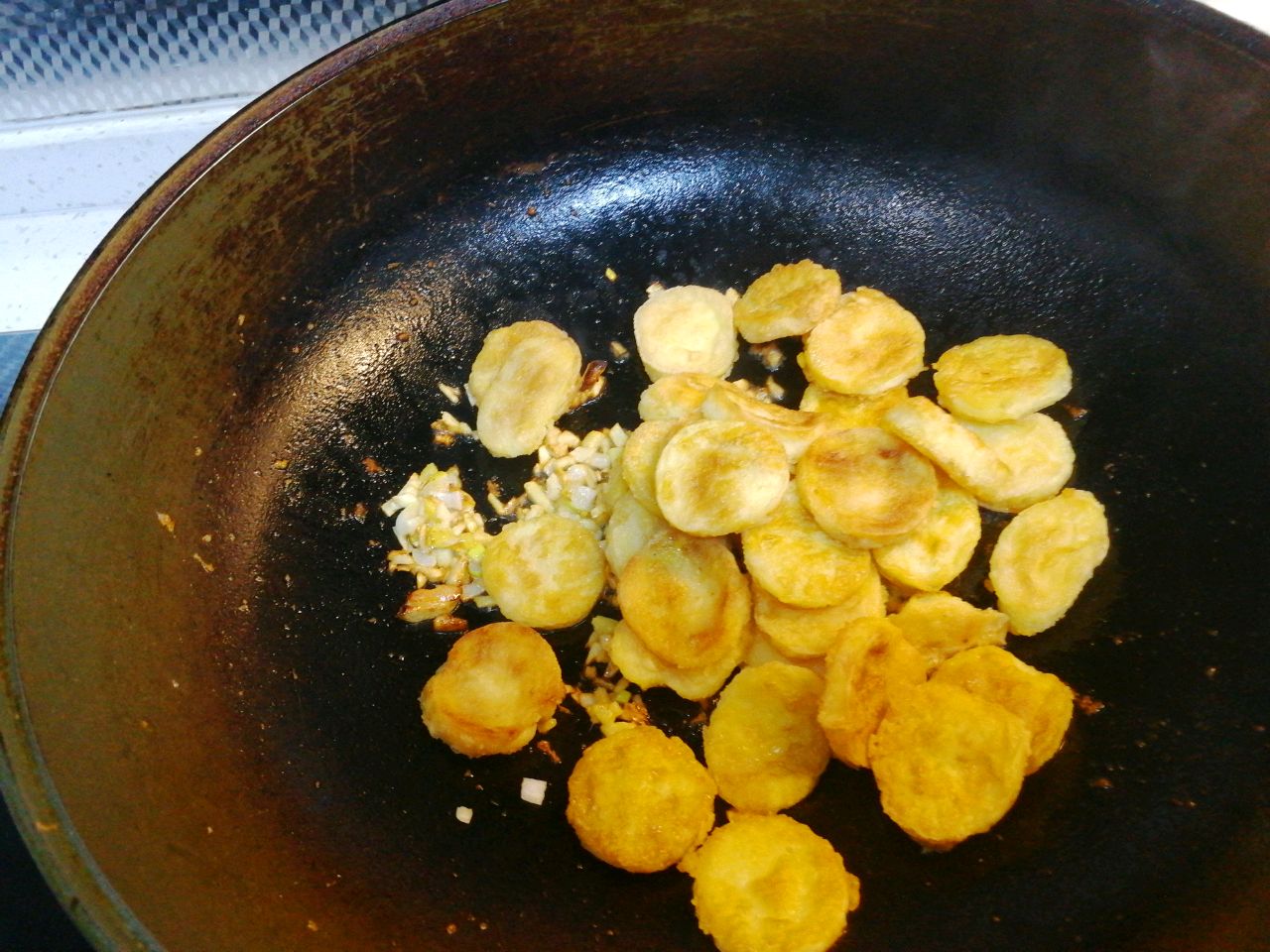 步骤8、锅中放油,把裹好淀粉的日本豆腐放入锅中,一面煎好再煎另一面。