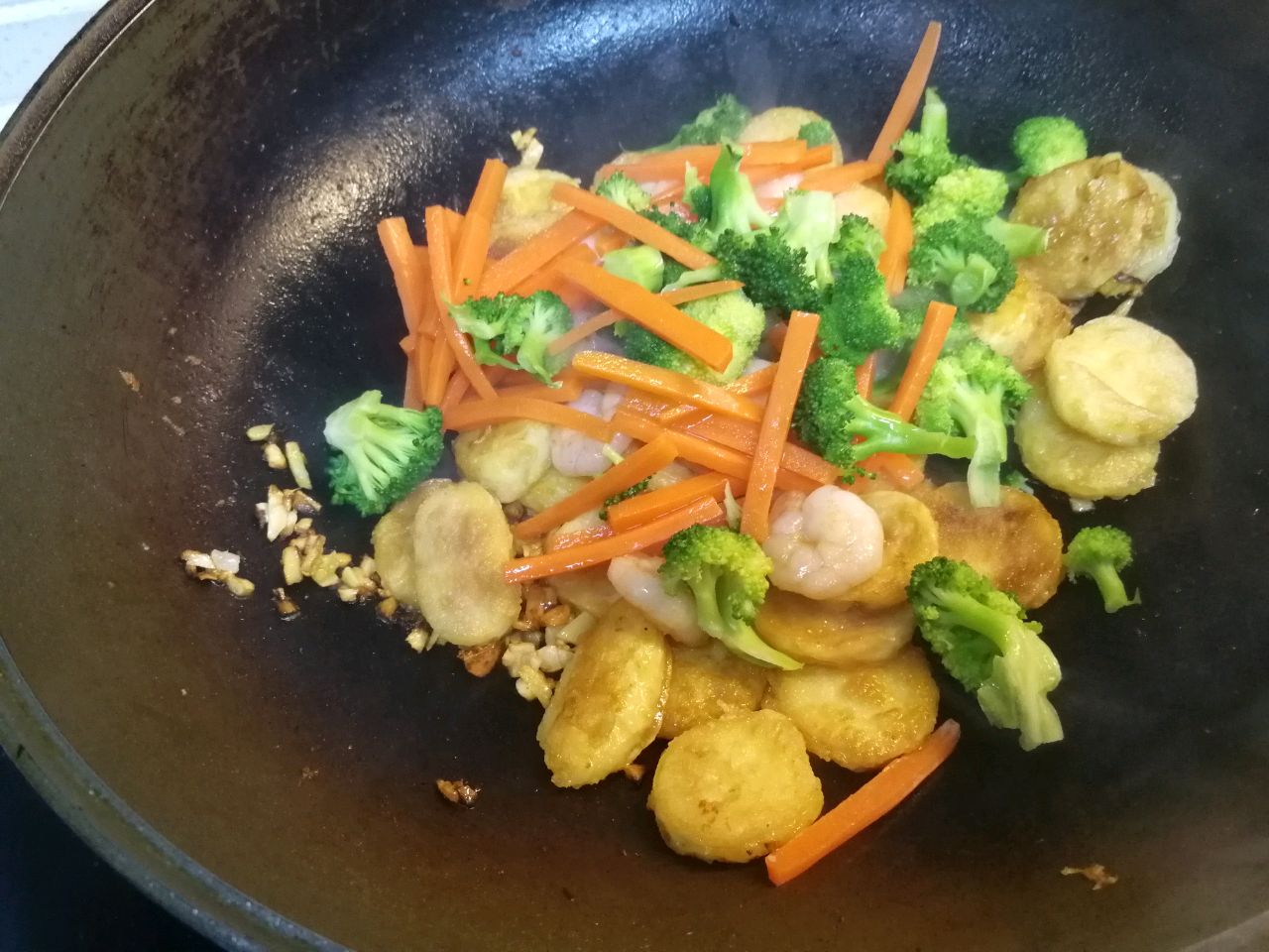 辅料:西兰花5朵、胡萝卜少半根、蒜2瓣、葱一节、姜2片、太太乐蘑菇精调味料1勺、料酒1勺、太太乐原味鲜头道特级鲜酱油2勺、玉米淀粉适量、盐1克、食用油适量、淀粉水适量