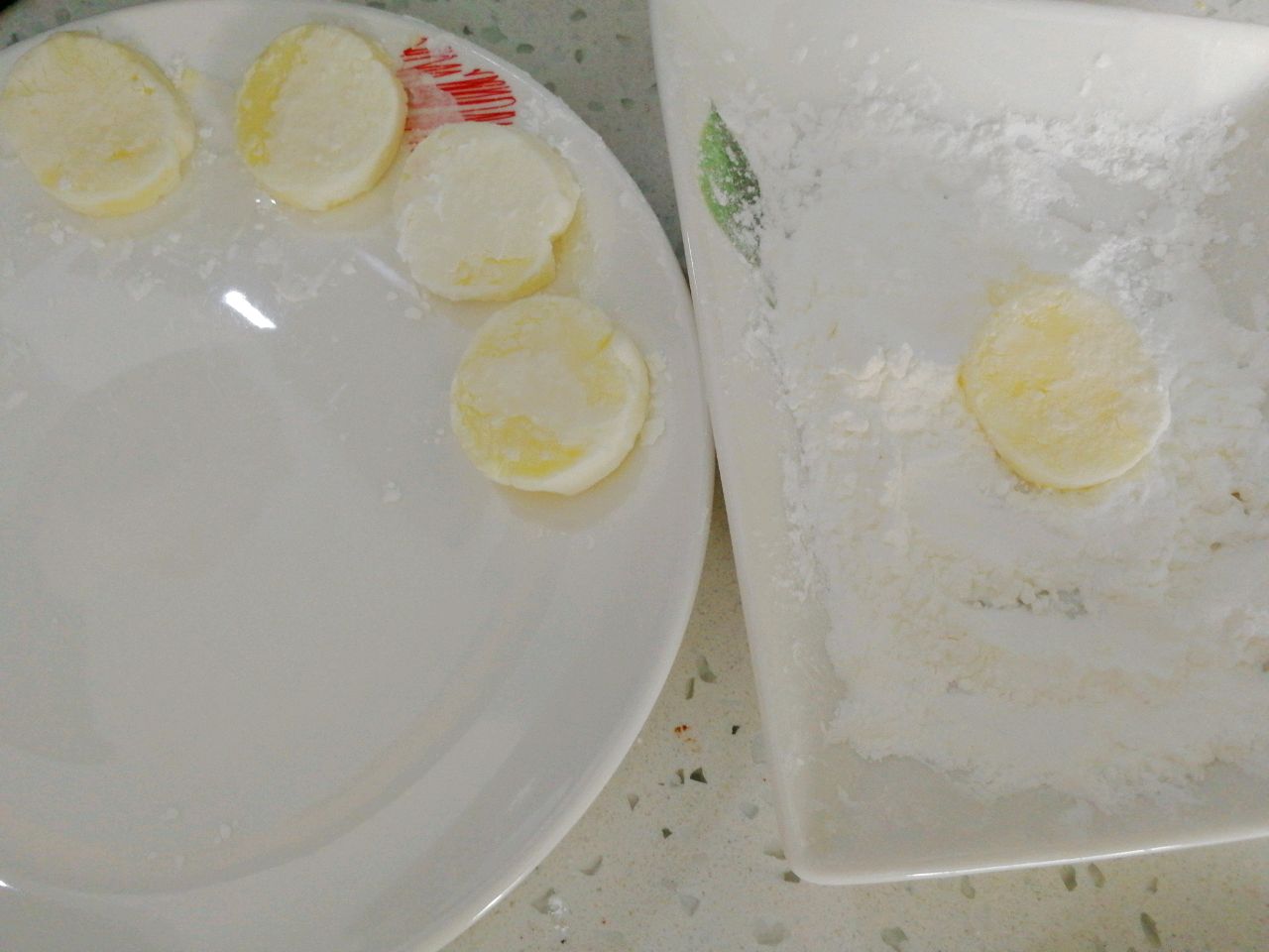 步骤7、将玉米淀粉放入盘中,把日本豆腐两面都沾上淀粉,一定要轻一点。