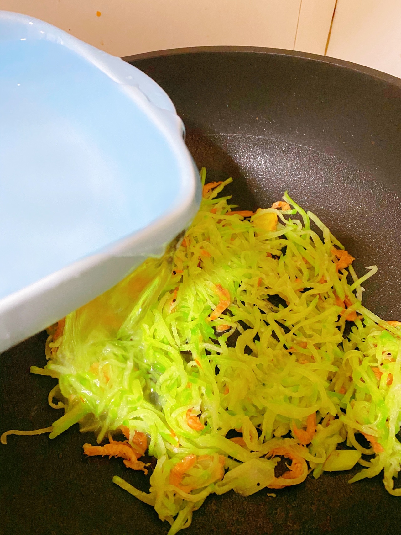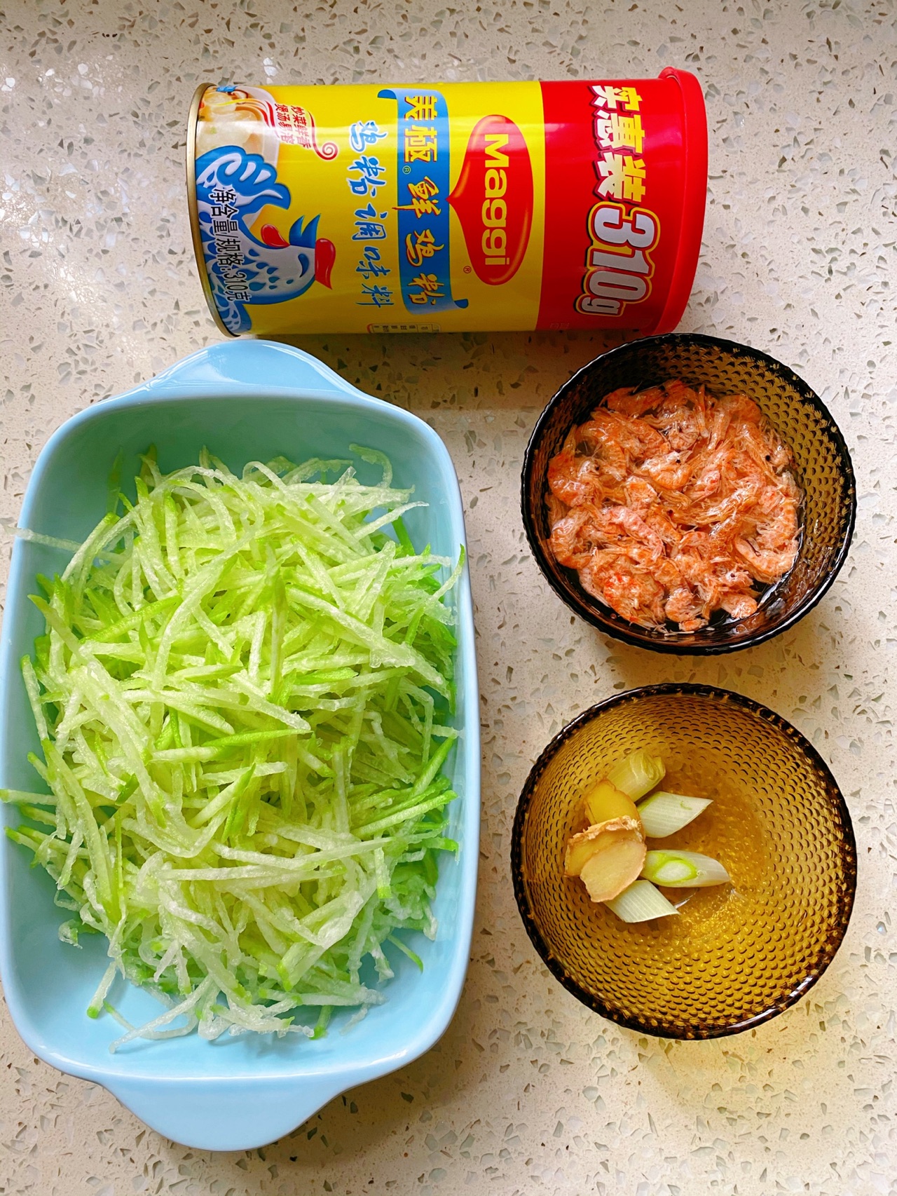 步骤2、将萝卜擦丝,虾皮泡下水,葱姜切好