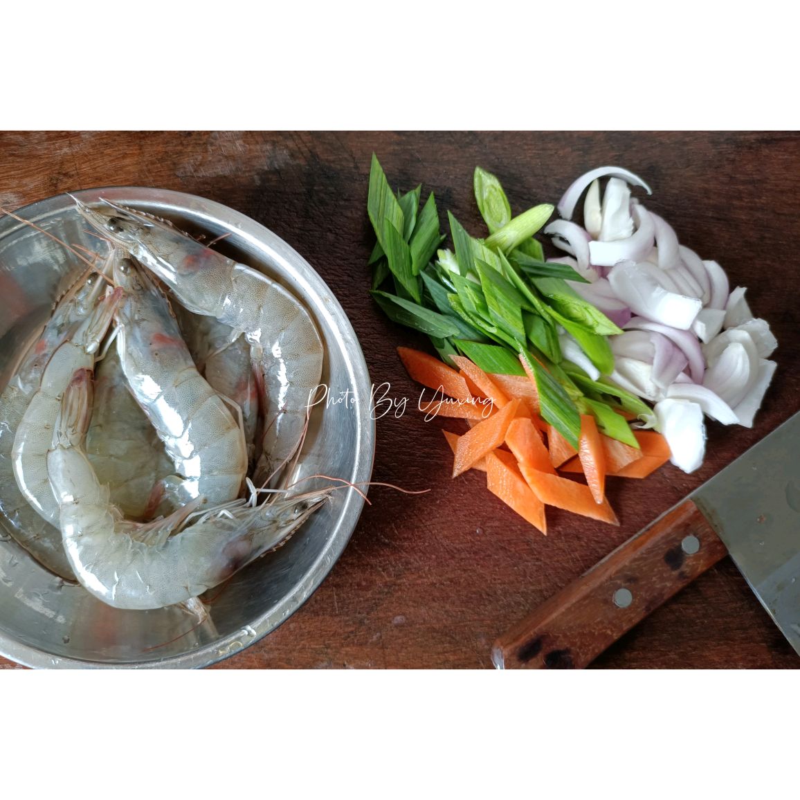 步骤4、将对虾洗净祛头祛壳祛泥线,然后对半切开备用