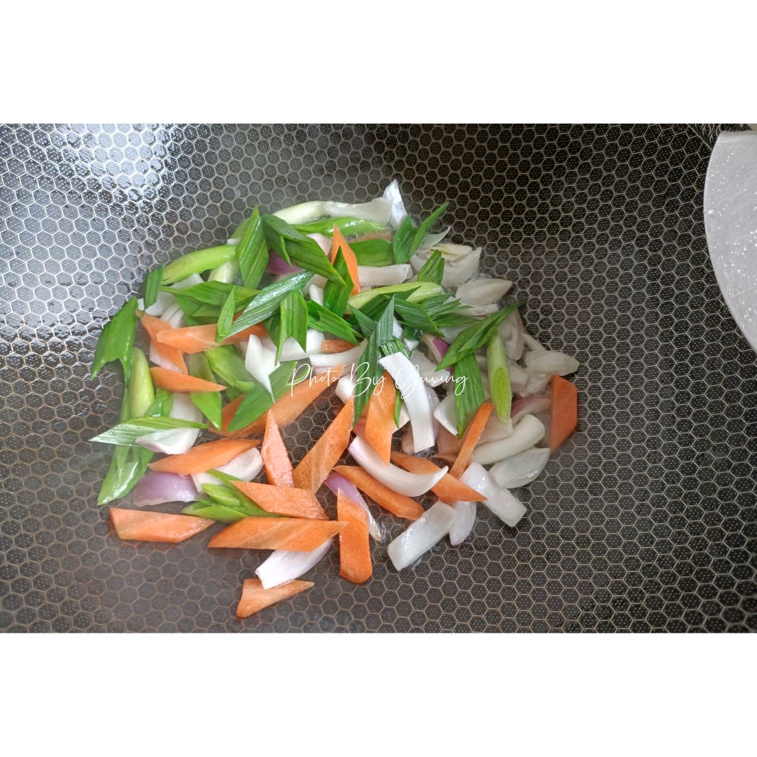 辅料:食用油适量、盐小半勺、生抽20克、洋葱半个、青蒜一根、胡萝卜小半根、开水一勺