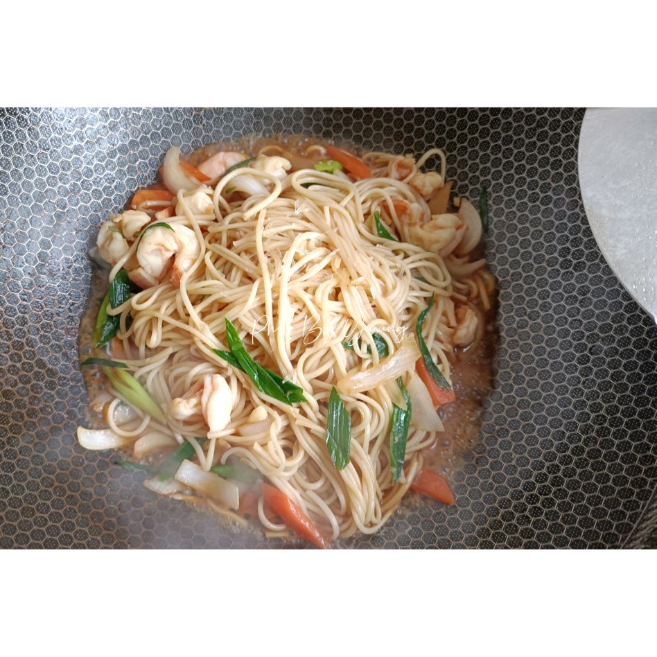 步骤7、接着倒入提前焯好的乌冬面,加入盐、生抽翻炒均匀