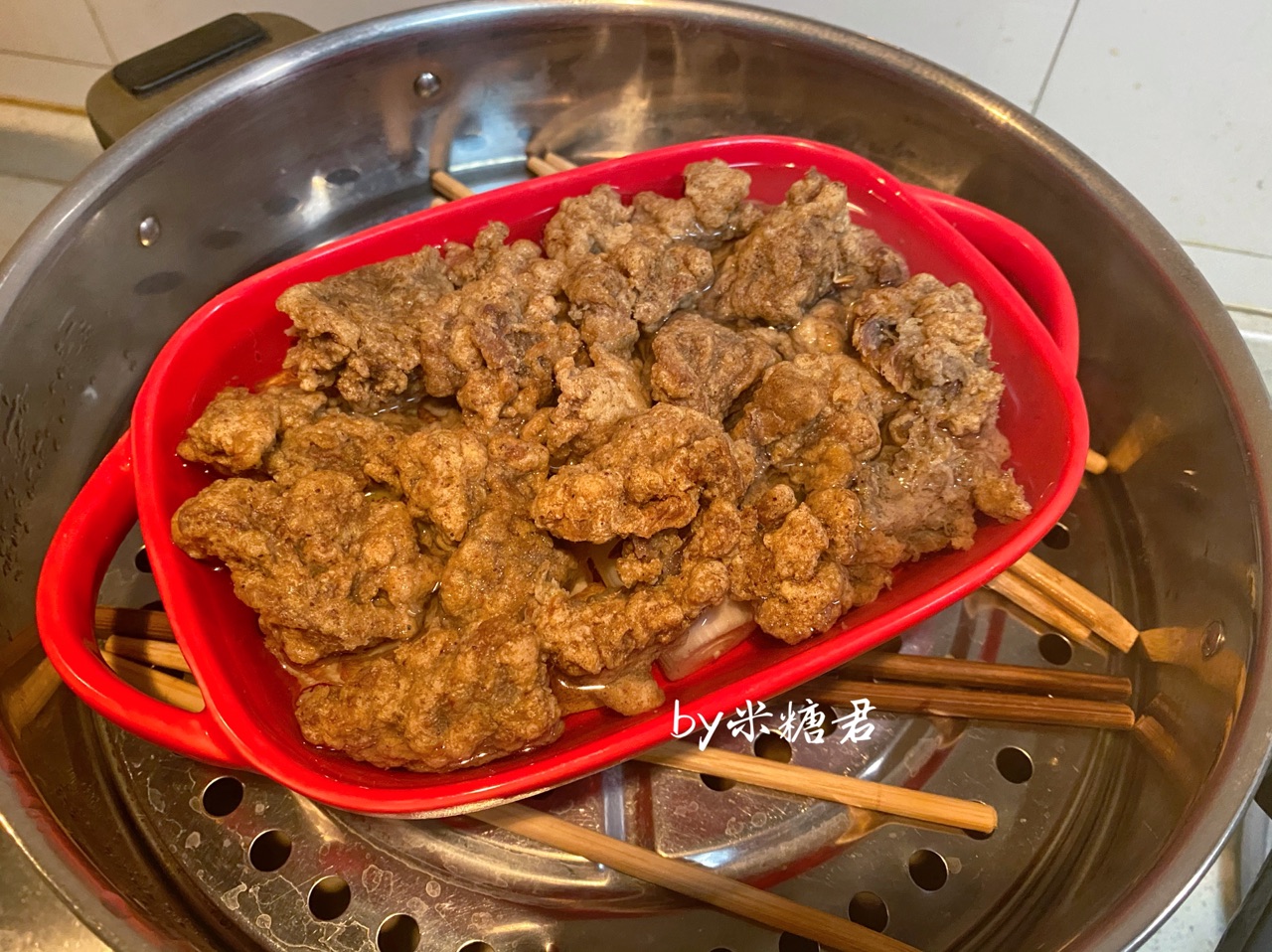 步骤5、放上炸好的小酥肉,倒入清水。(清水的量最好与肉持平)放入蒸锅,大火蒸1个小时。