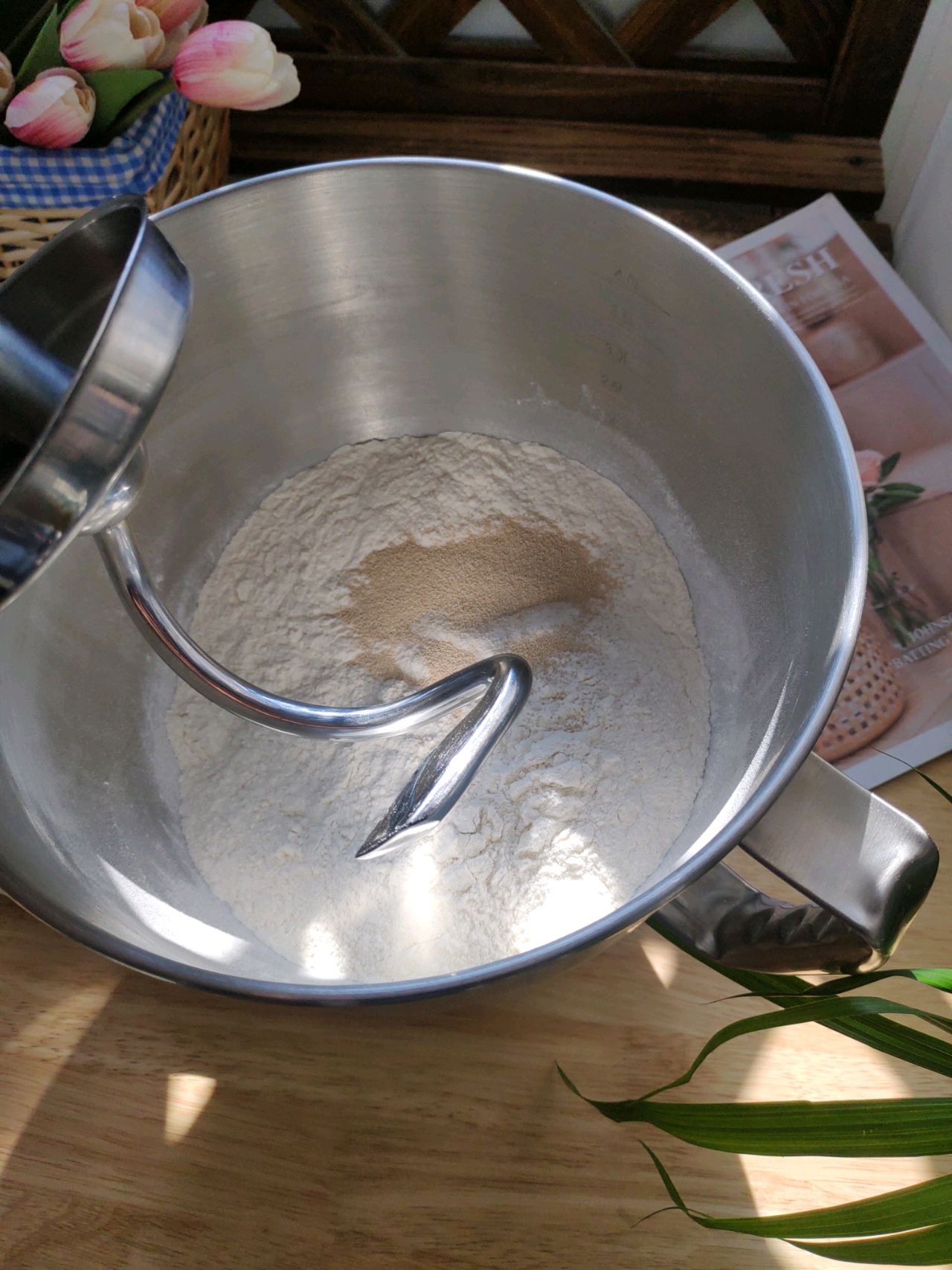 步骤1、厨师机的搅拌锅倒入面粉和酵母粉