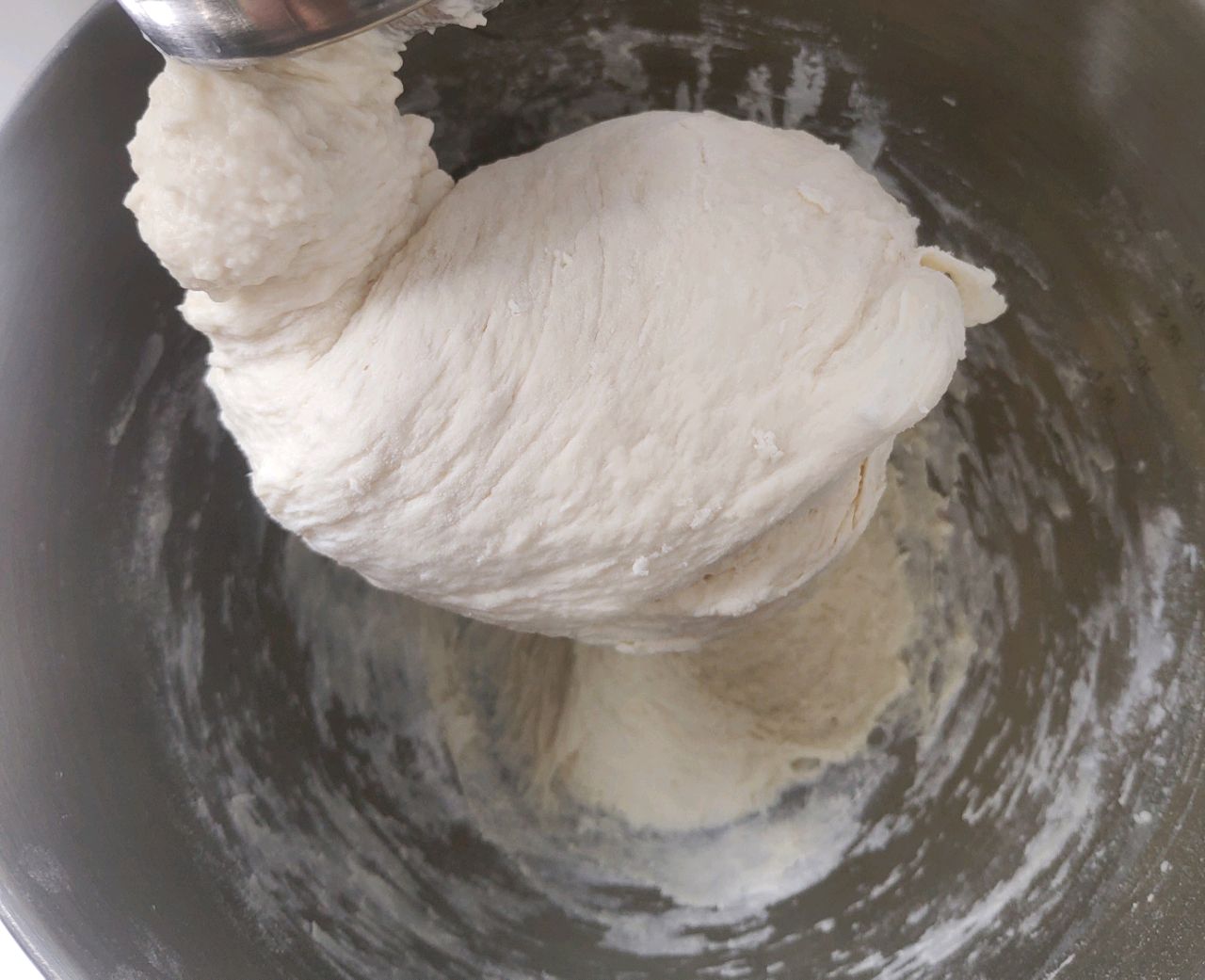 步骤2、开低挡将面粉和水充分搅拌成絮状,然后继续开4档揉5分钟,活成软硬适中而且光滑的面团。
