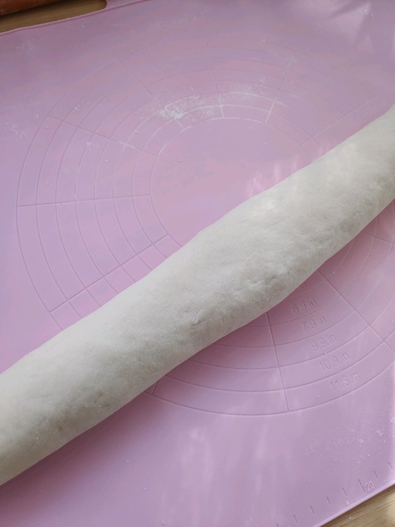 步骤4、面团发酵好之后,开始进行排气,搓成光滑的长条,