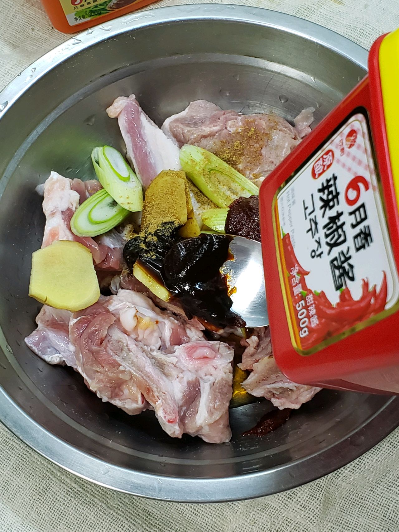 辅料:味达美臻品料酒1勺、六月鲜特级淡盐酱油2勺、6月香韩式辣椒酱1勺、6月香甜面酱1勺、五香粉半勺、盐1勺、葱1根、姜4片