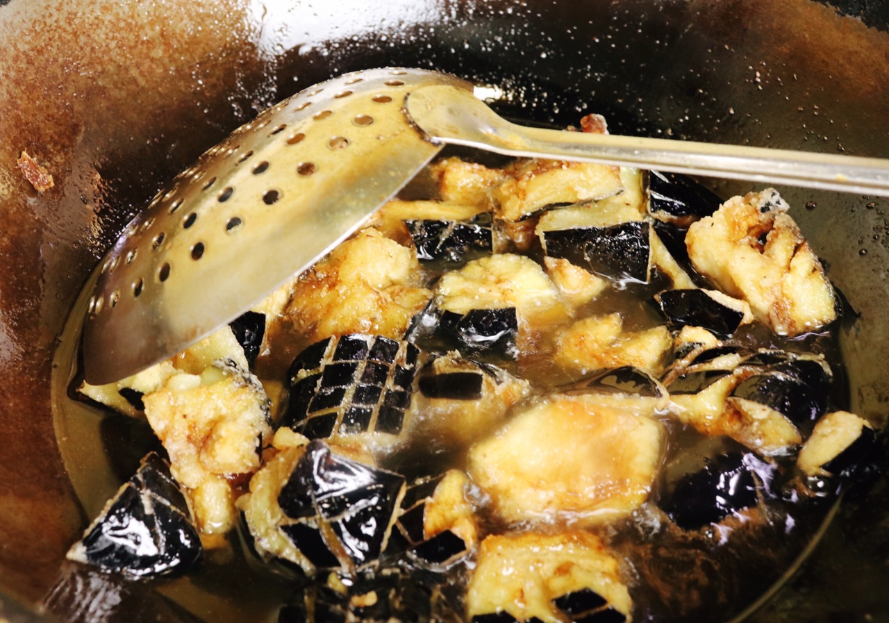 步骤2、茄子撒上淀粉炸,复炸2次最好更焦。