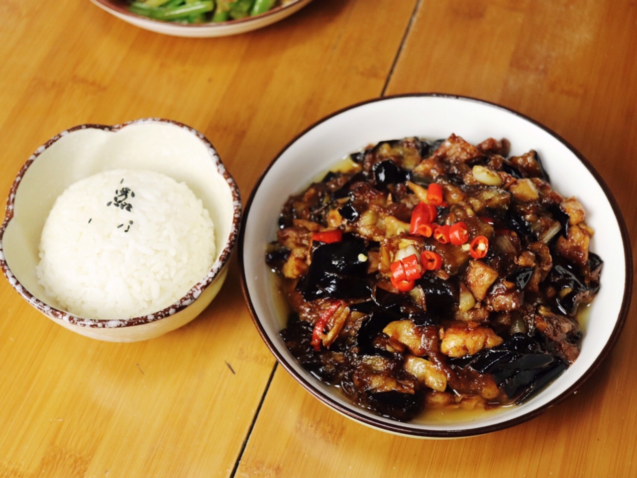 步骤1、1.茄子切块盐水浸泡15分钟拧干撒淀粉炸。2.葱姜蒜、小辣椒小葱切丁。3.咸鱼浸泡一天切丁,五花肉切丁。4.香菇、西红柿切丁。