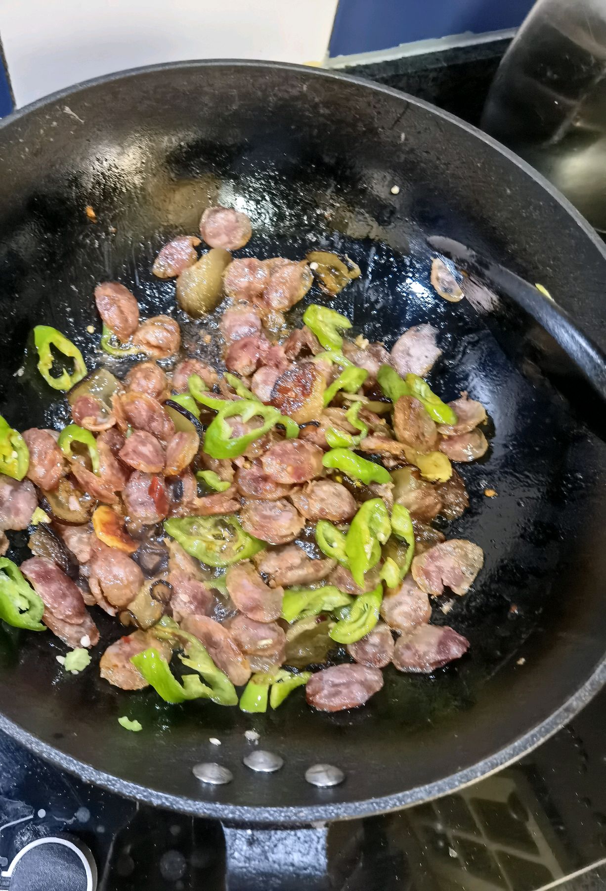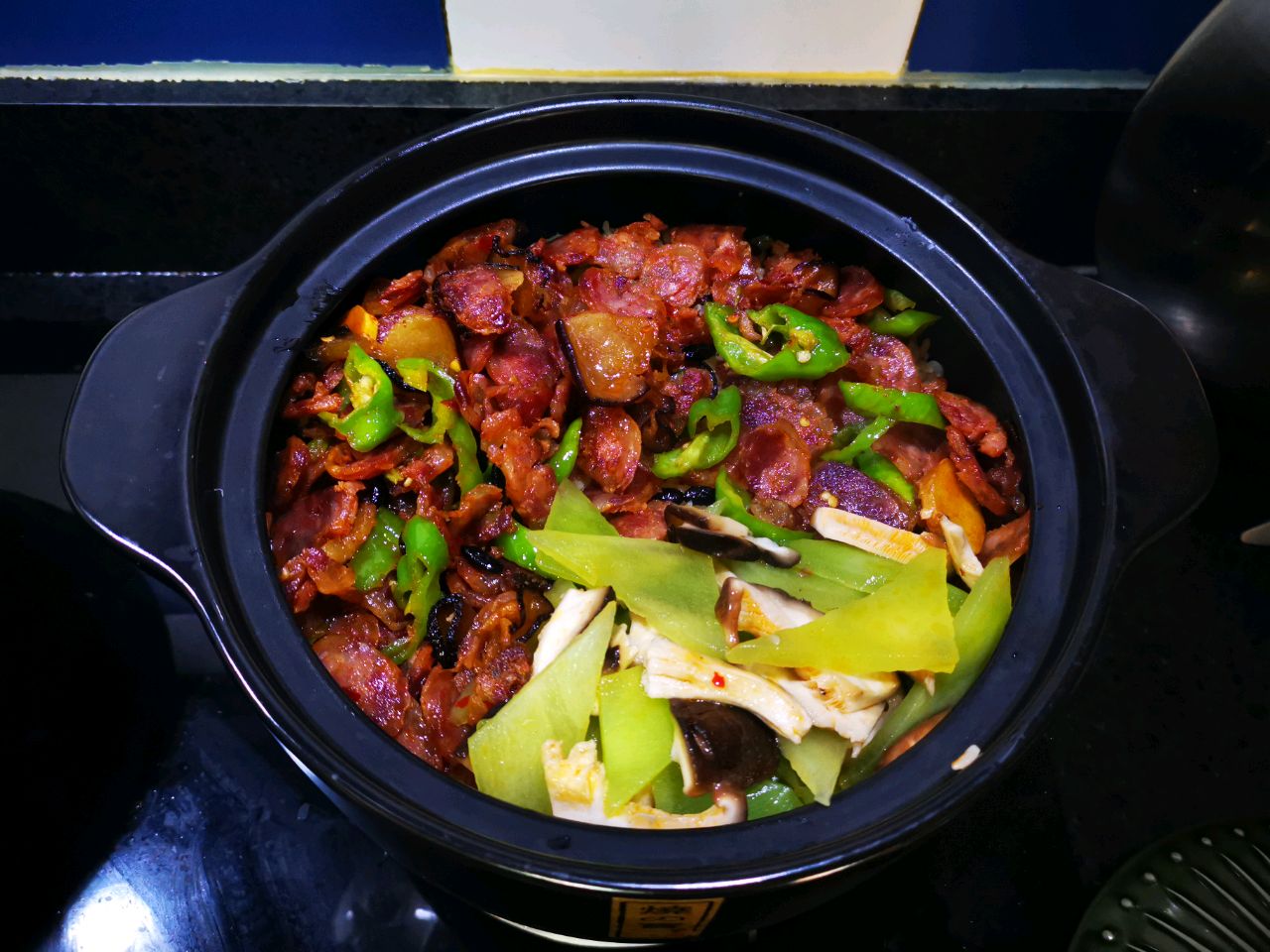 步骤11、带饭九成熟,放入备好的香肠和菜一起焖