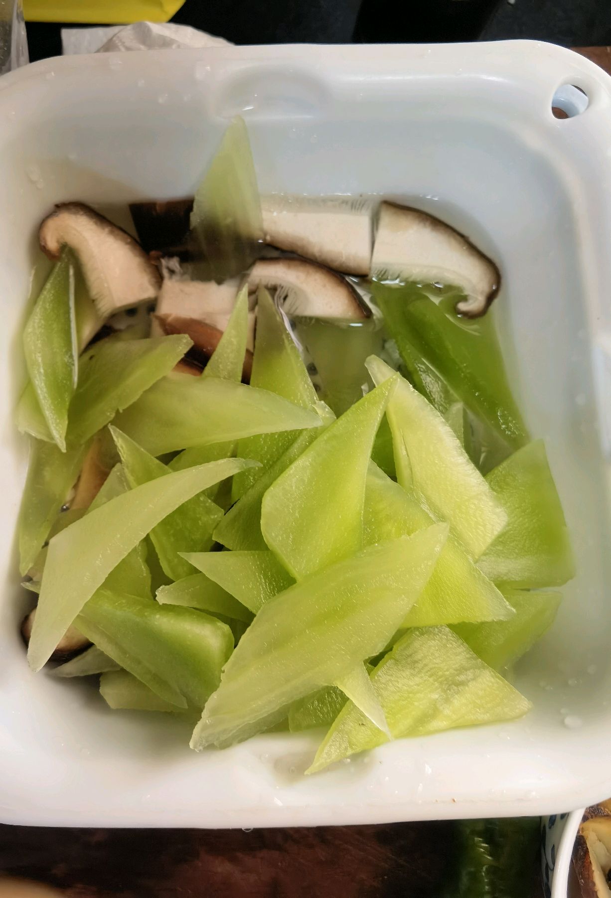 辅料:香葱适量、香菇3朵、莴笋半根、青椒1个、香米适量