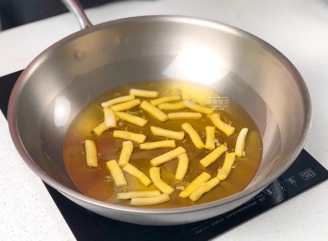 步骤12、鹅妈妈钛晶锅中倒入适量植物油,冷油入锅炸(一定要冷油入锅炸,否则江米条容易变形,炸裂);