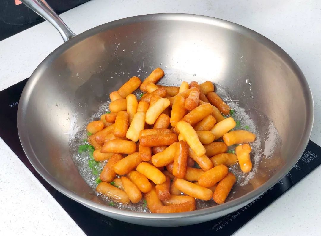 步骤19、倒入炸好的江米条、葱花;