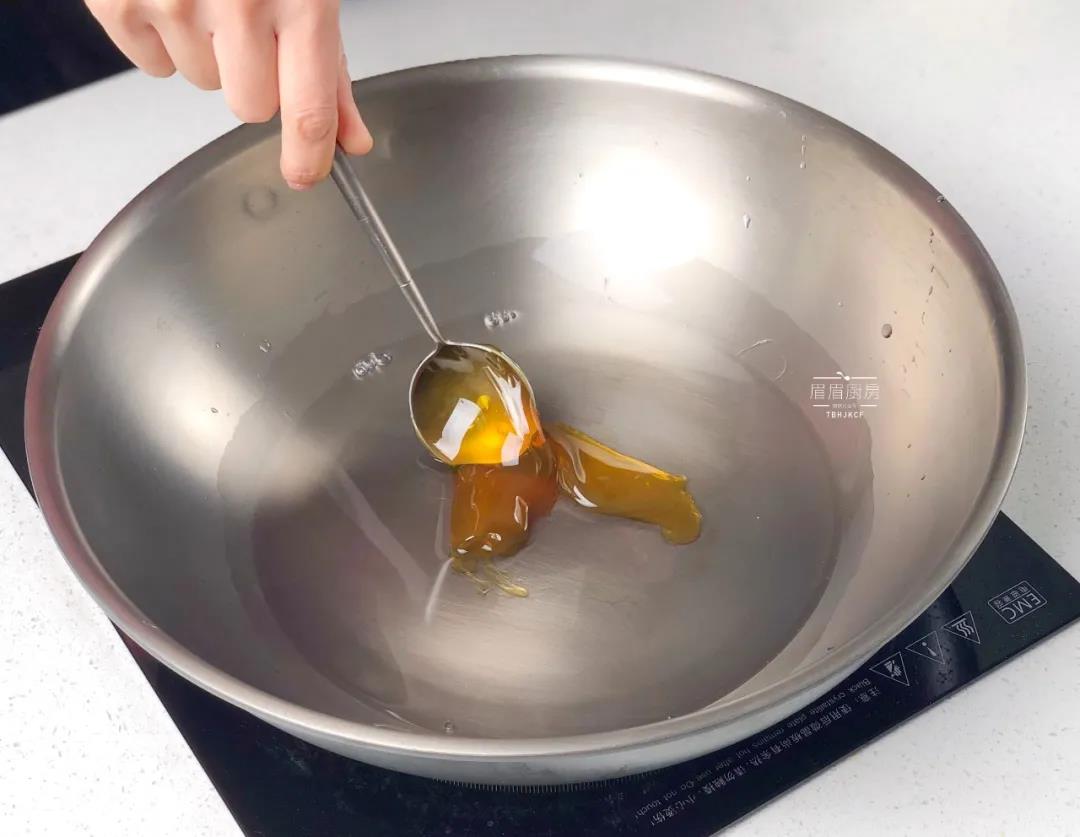 步骤16、接着就是挂霜,锅中倒入60克清水,100克白糖;