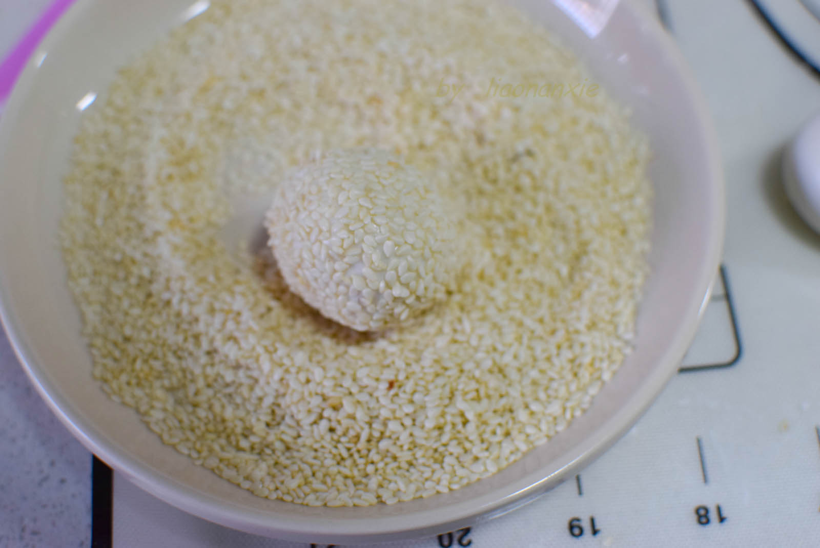 步骤6、脱皮白芝麻本身比较容易粘在食物表面上面,麻团表面滚水后粘上芝麻,几乎不用特别处理,就可以粘得很牢固。