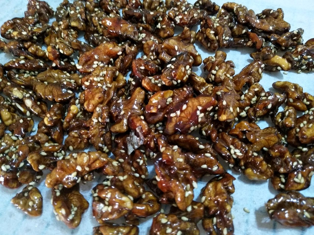 步骤14、中间可以换张油纸,因为油还是挺多的。晾凉,香香甜甜脆脆的琥珀核桃仁就做好啦。小侄子说超级好次,嘎嘣脆。