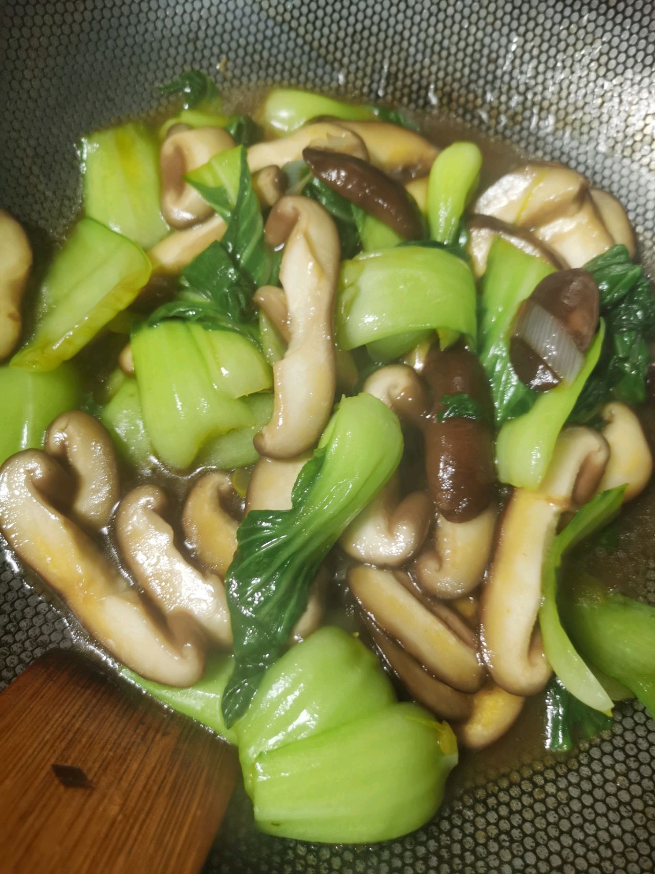 步骤6、香菇和油菜梗都炒软了就可以出锅了!