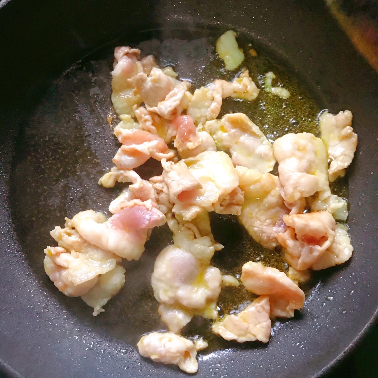 步骤5、锅中倒入适量菜籽油,下肉片炒变色、炒香。