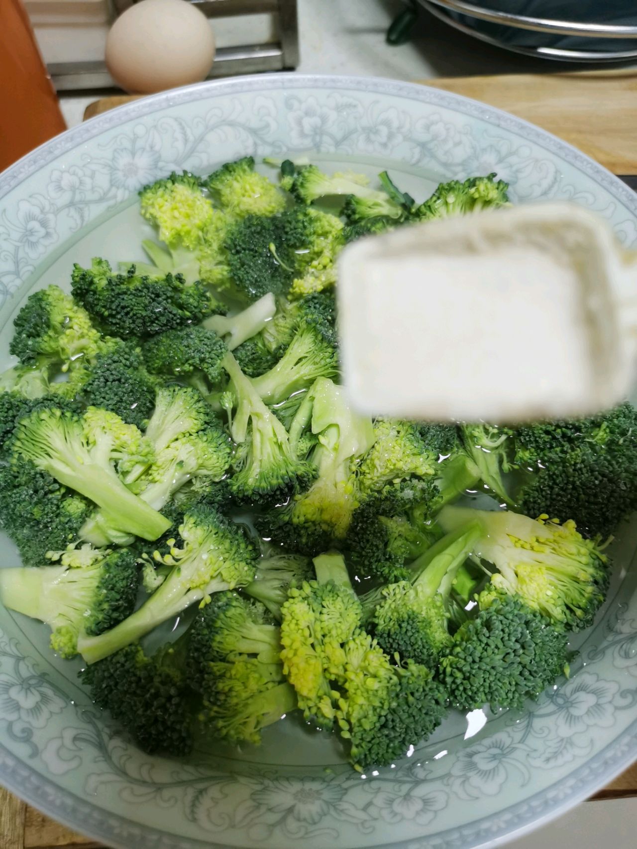步骤2、西兰花焯水,锅中放一点点食盐和食用油,会更绿。