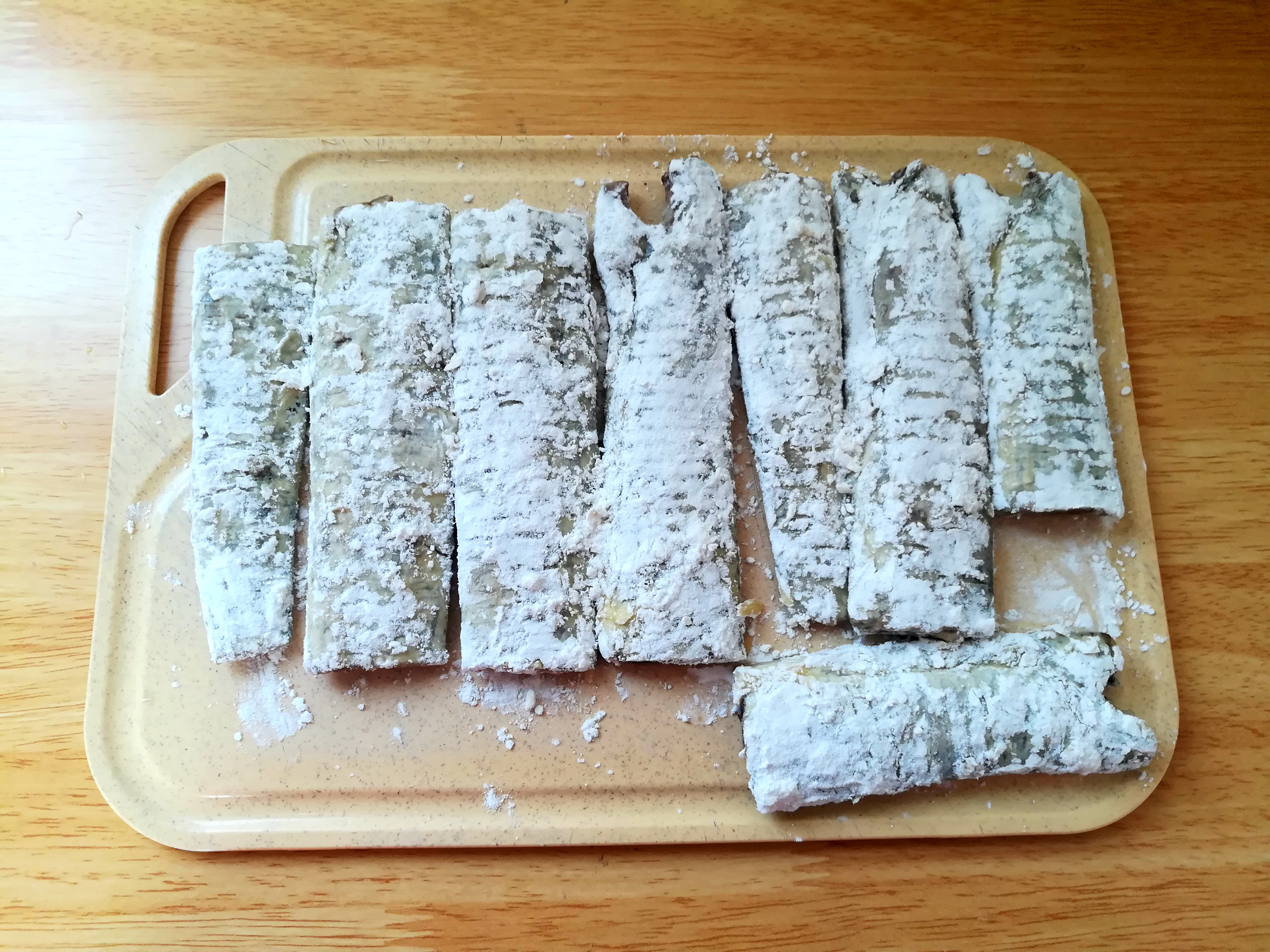 步骤6、带鱼块两面裹上一层玉米淀粉