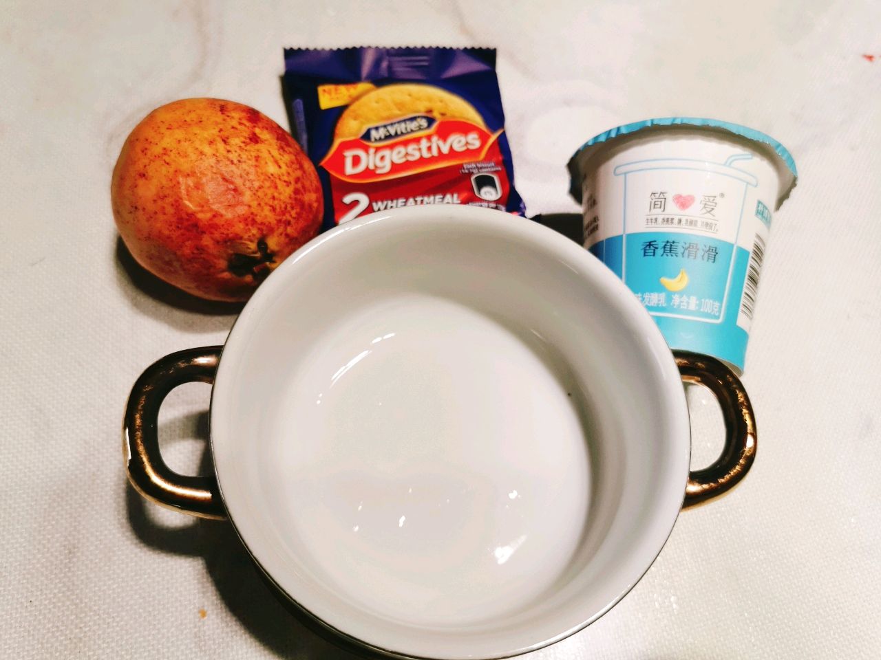 步骤1、西餐双耳杯酸奶饼干芭乐坚果准备好