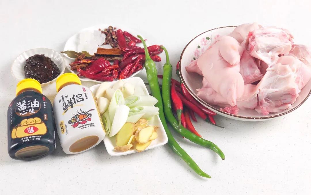 辅料:猪蹄2只、蒜适量、葱段适量、八角3个、干辣椒适量、桂皮2片、香叶2片、花椒适量、郫县豆瓣酱适量、酱油心生适量、小鲜侣调味汁适量、雪碧250g、盐适量、冰糖3-4颗、红黄辣椒适量