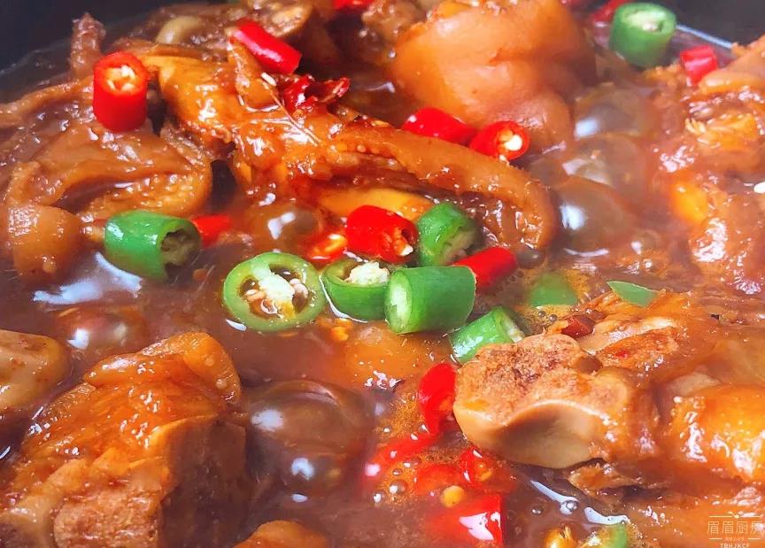 步骤11、猪蹄在慢炖中融合了酱香和鲜辣,红润诱人;